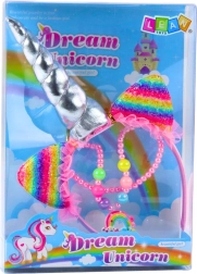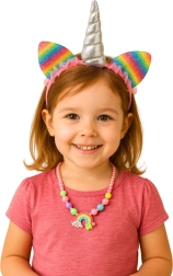 Il set DREAM UNICORN porta ai bambini la gioia del travestimento e della fantasia. Il cerchietto con orecchiette arcobaleno ricamate di paillettes e corno argentato lucente, insieme alla collana di perline colorate, crea un outfit fiabesco in un attimo. Perfetto per carnevale, feste di compleanno, mascherate o servizi fotografici di famiglia.