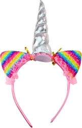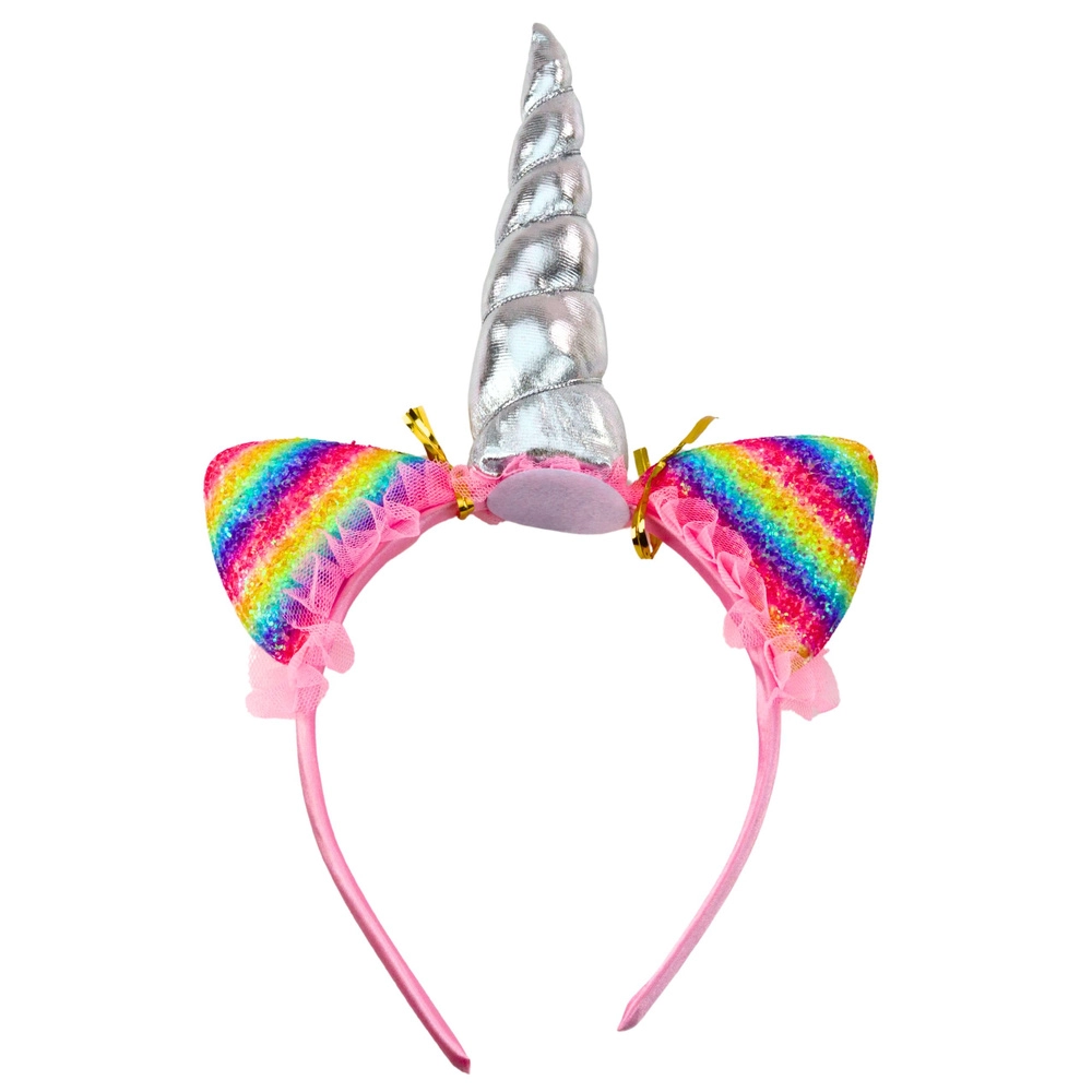 Orecchiette arcobaleno, glitter e un corno argentato a spirale trasformano ogni bimbo in un piccolo unicorno in pochi secondi.