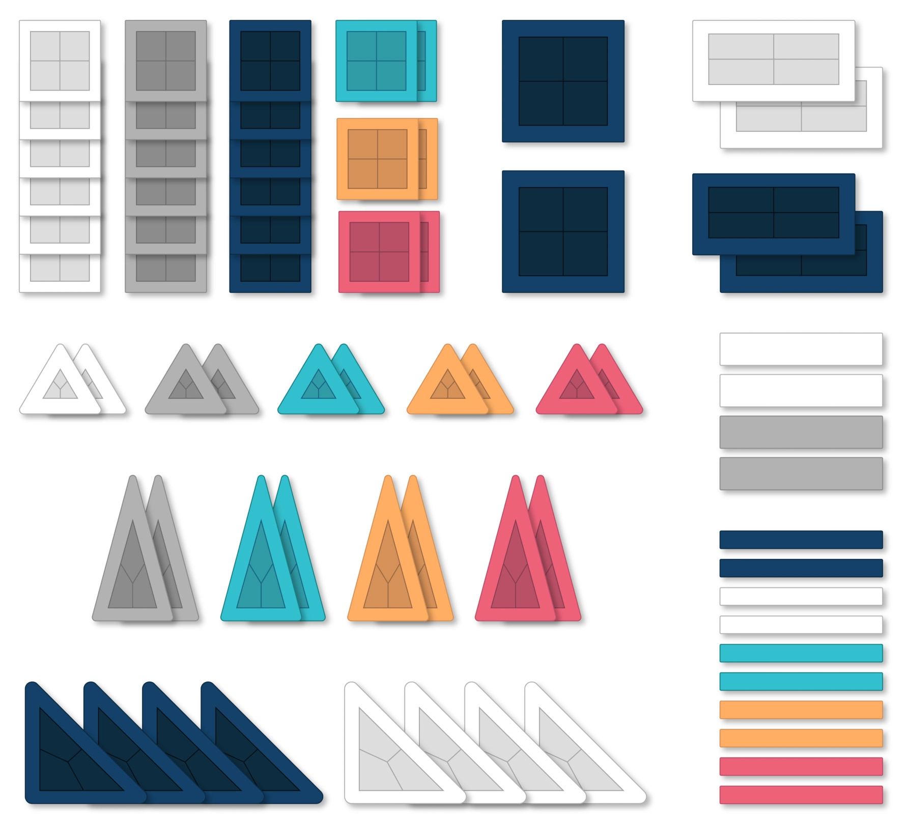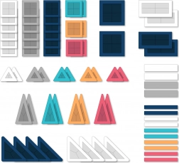 24 quadrati piccoli, 10 triangoli equilateri piccoli, 8 triangoli rettangoli, 8 triangoli isosceli, 2 quadrati grandi, 3 rettangoli, 4 rettangoli lunghi, 10 “linee” (rettangoli), libretto illustrato