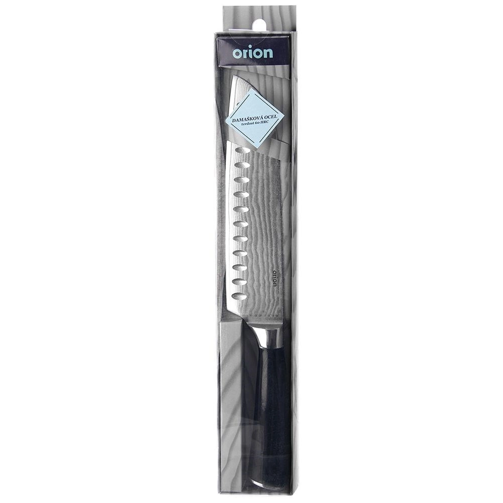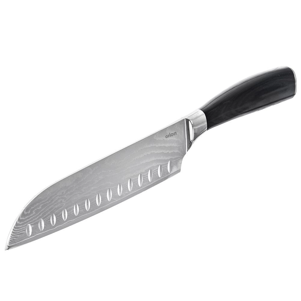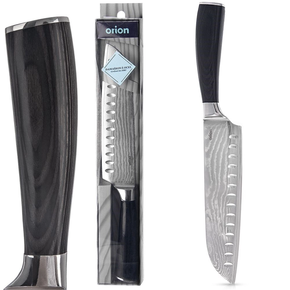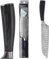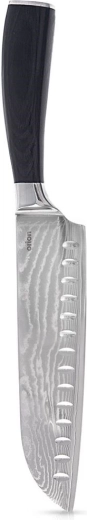 Preciso coltello da cucina Santoku con lunghezza totale di 31 cm e lama da 18 cm in acciaio damasco a 67 strati per un'affilatura eccezionale e lunga durata. L'impugnatura ergonomica in legno pakka si adatta perfettamente alla mano, mentre le scanalature Granton sulla lama riducono al minimo l'adesione degli alimenti. Ideale per tagliare, tritare e affettare frutta, verdura e carne, sia in cucina domestica che professionale.
