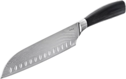 Il coltello Santoku combina ispirazione giapponese e standard europei di lavorazione. L'acciaio damasco a 67 strati offre eccezionale durezza, resistenza e affilatura duratura, mentre il profilo piatto della lama facilita tagli precisi e una preparazione rapida degli ingredienti. Grazie alle cavità Granton, le fette non aderiscono alla lama e il taglio risulta fluido.