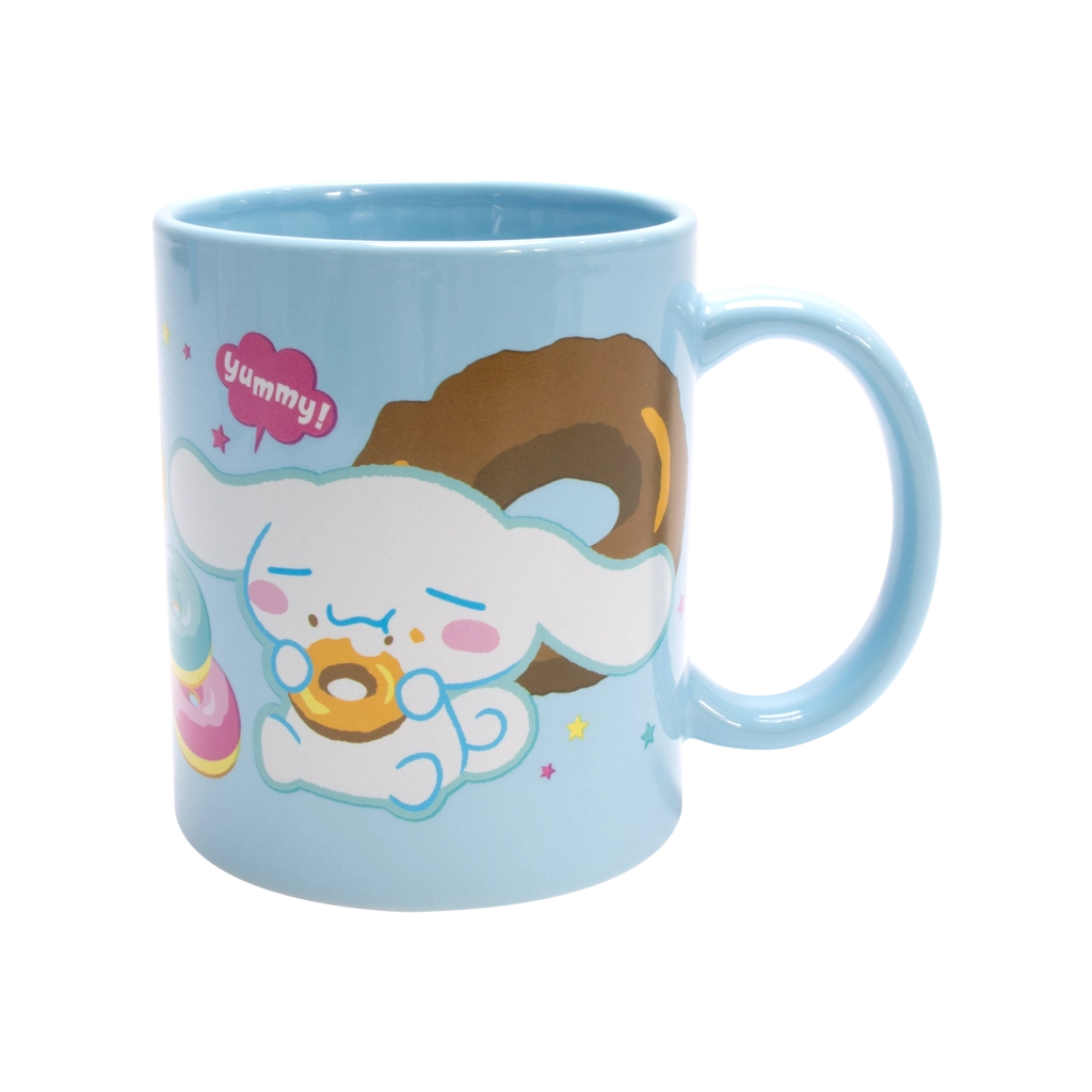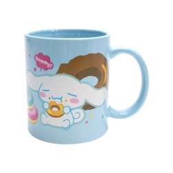 Tazza in ceramica azzurro chiaro con stampa di Cinnamoroll e donuts, ideale per il caffè del mattino o il tè della sera. Smaltatura lucida e manico confortevole per una presa piacevole.