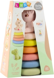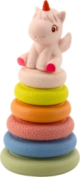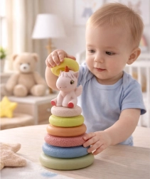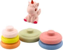Adorabile piramide impilabile sensoriale a tema unicorno per bambini da 6 mesi che sviluppa motricità fine, coordinazione mano–occhio e percezione sensoriale. Include sei anelli morbidi in materiale eco con diverse texture e una figurina di unicorno con fischietto per un'interazione divertente. Forme sicure, morbide e arrotondate ideali per il gioco quotidiano a casa.