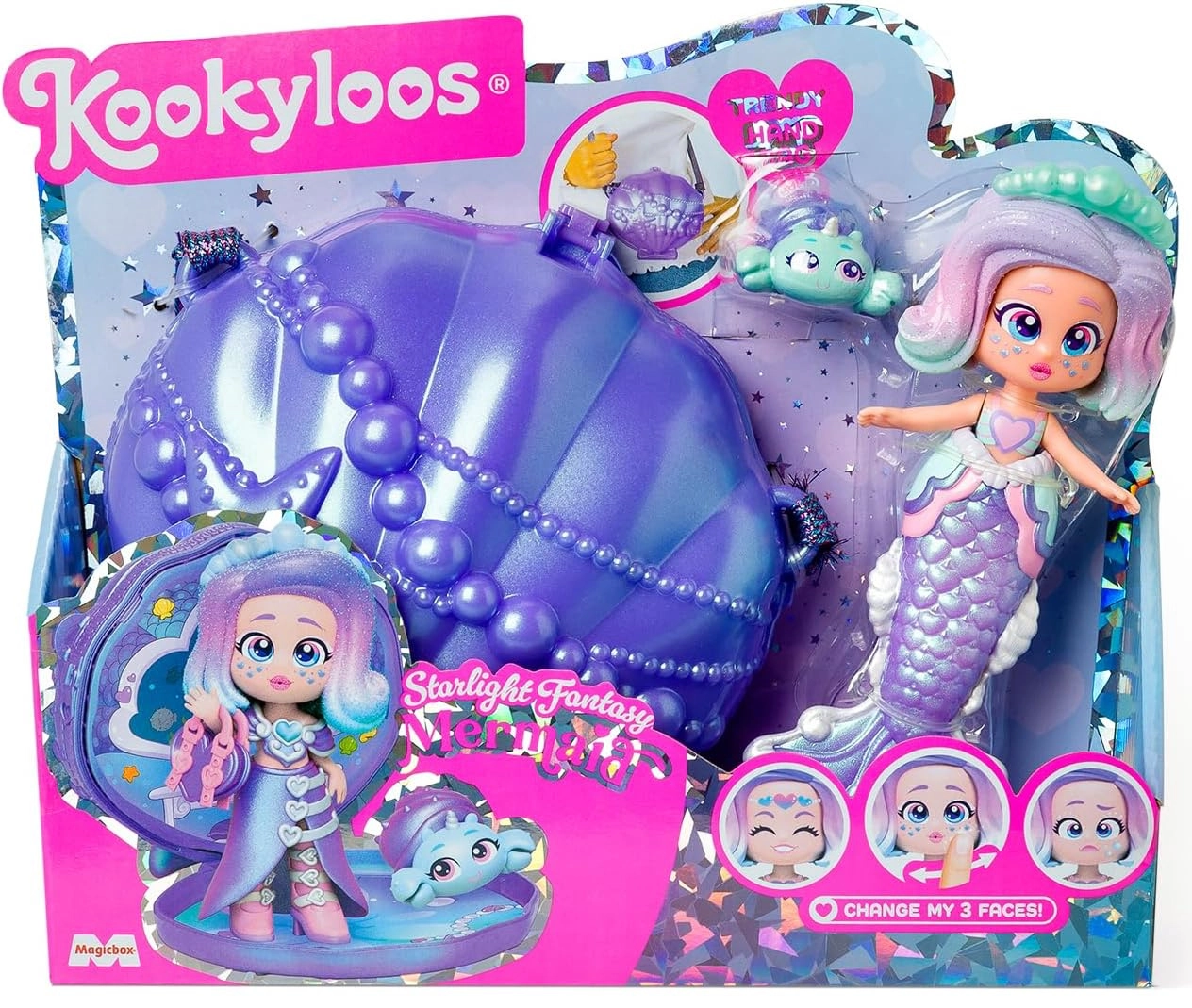 Scopri il mondo incantato con la figurina KookyLoos Starlight Fantasy – una dolcissima sirena con coda scintillante, outfit intercambiabile e una stilosa borsetta a forma di conchiglia. Divertimento 2 in 1: la coda rimovibile trasforma la sirena in una bambolina pronta a giocare sulla terraferma. Inclusi un animaletto marino unico e accessori a tema marino per storie creative.