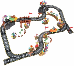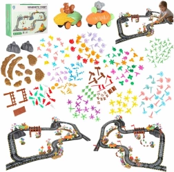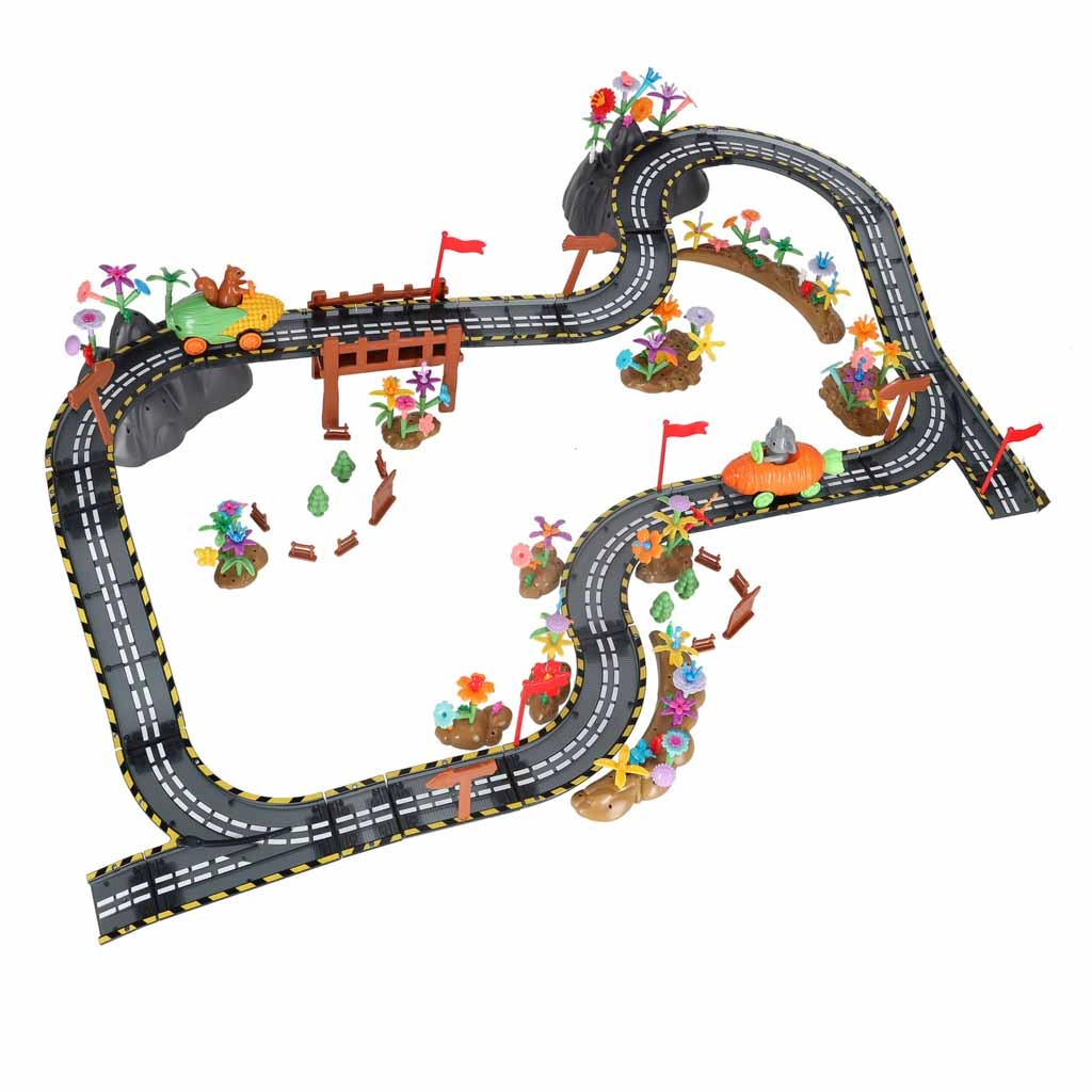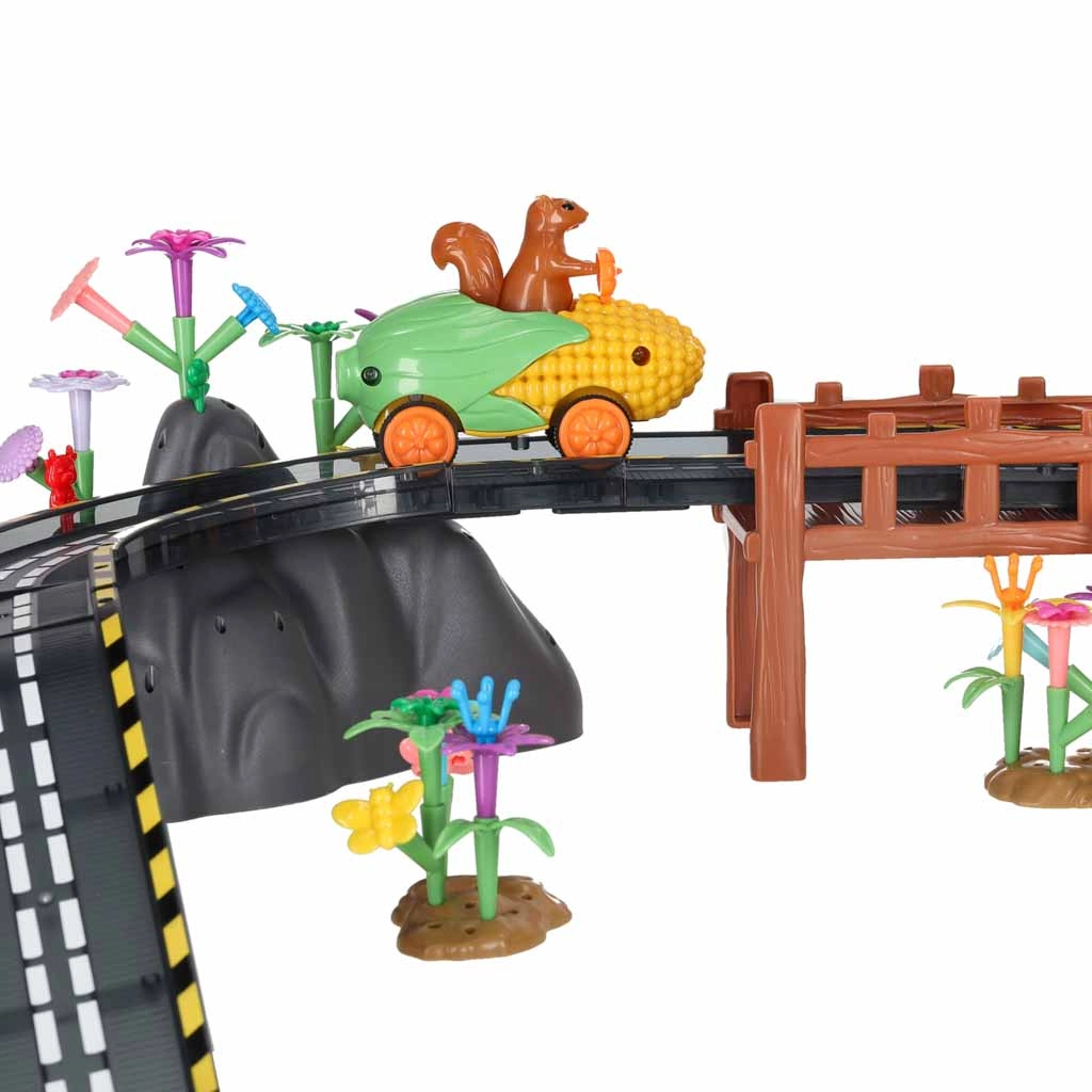 Il set include 2 veicoli con simpatici personaggi (scoiattolo e koala), ponte, barriera, ostacoli rocciosi e connettori di rinforzo per una pista più stabile. Ottimo per lo sviluppo delle competenze STEM: pianificazione, pensiero logico e abilità costruttive.