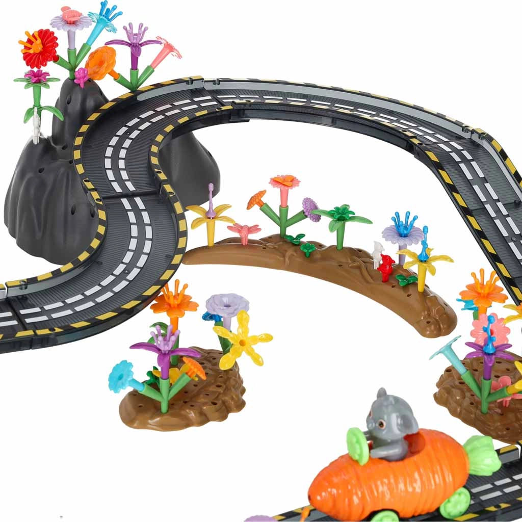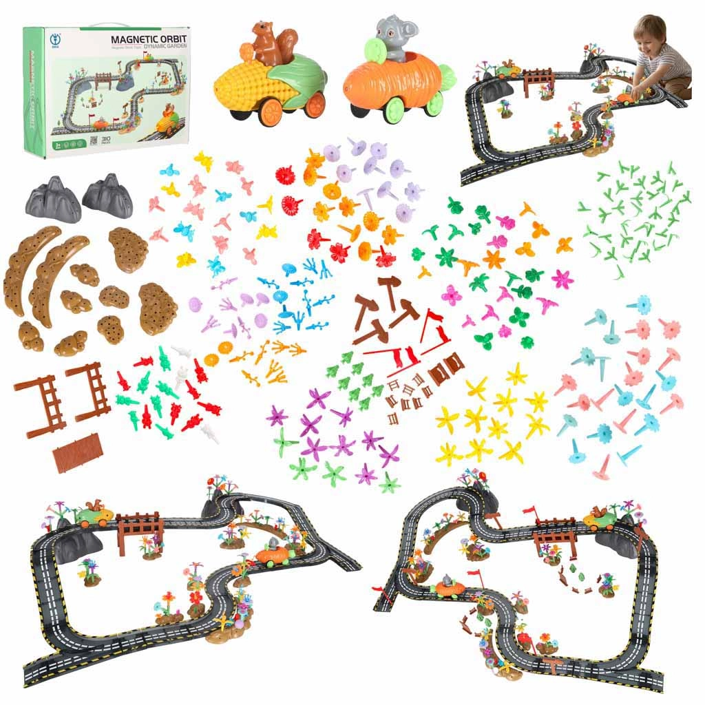 Scopri il mondo creativo delle costruzioni con questa pista da corsa magnetica da 310 pezzi. I bambini possono costruire e ricostruire facilmente la propria pista, arricchendola con ponti, rocce, staccionate e fiori. Due adorabili macchinine luminose (carota e mais) con animaletti alla guida offrono un gioco più dinamico, mentre il collegamento magnetico garantisce stabilità e montaggio fluido. Un’attività STEM ideale per sviluppare logica, creatività e fantasia.