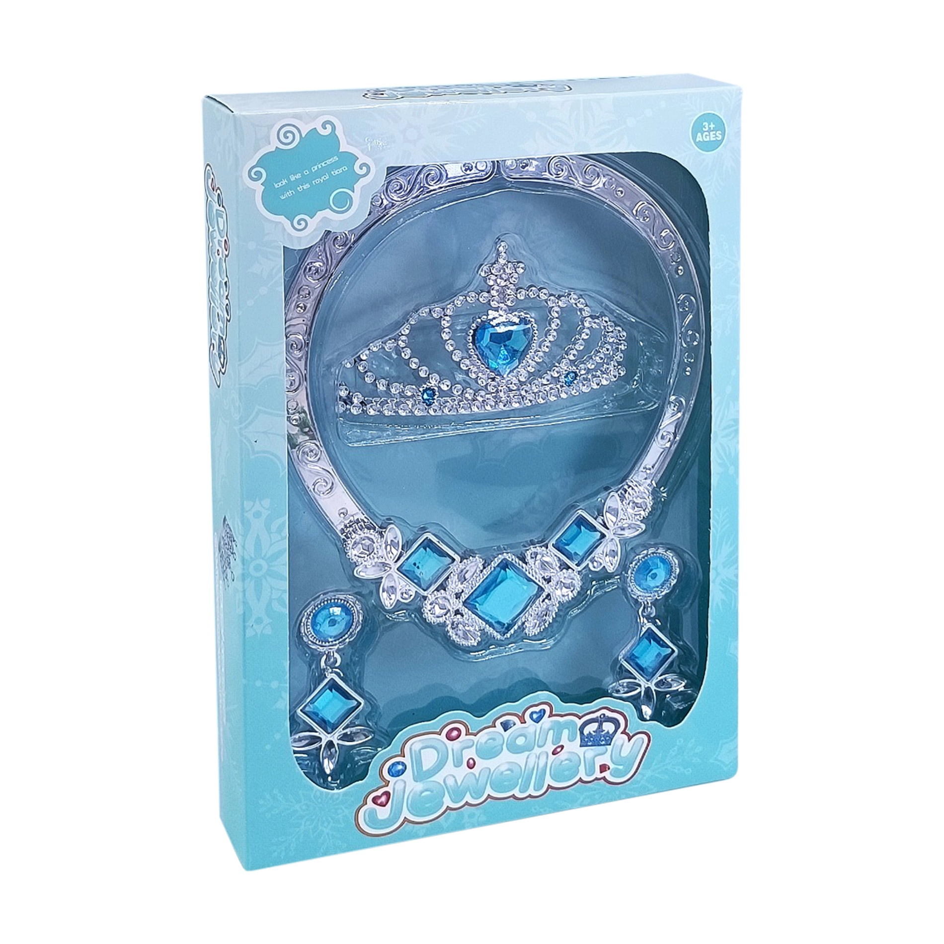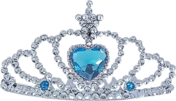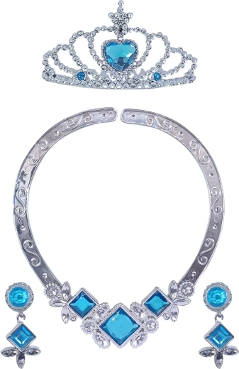 Elegante set di accessori per bambine che in un attimo trasforma ogni piccola signorina in una principessa da fiaba. Include corona, collana e orecchini in colore argento con luminosi pietrini blu, ideale per carnevale, feste per bambini e giochi da principessa.