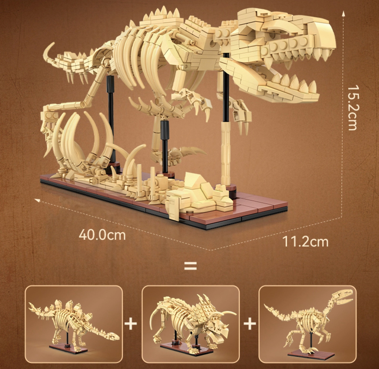 Costruisci gli scheletri dettagliati di Triceratopo, Stegosauro e Velociraptor con 825 pezzi ed esponili sui supporti. Ogni modello ha articolazioni snodate per pose dinamiche.