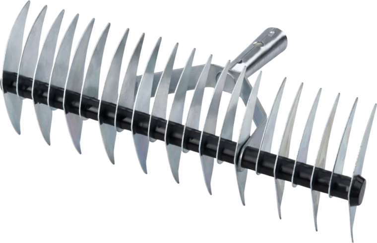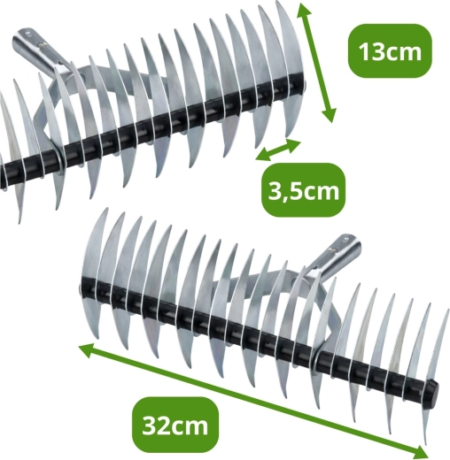 Lo strumento è realizzato in metallo resistente ed è dotato di due serie di denti per tagli fitti e radi in base allo stato del prato. L’ampia testa di lavoro (34 cm) aumenta la produttività, mentre i denti affilati (21 pz) penetrano nel cotico con il minimo sforzo. Ideale anche per la trasemina, preparando il suolo ai nuovi semi.
