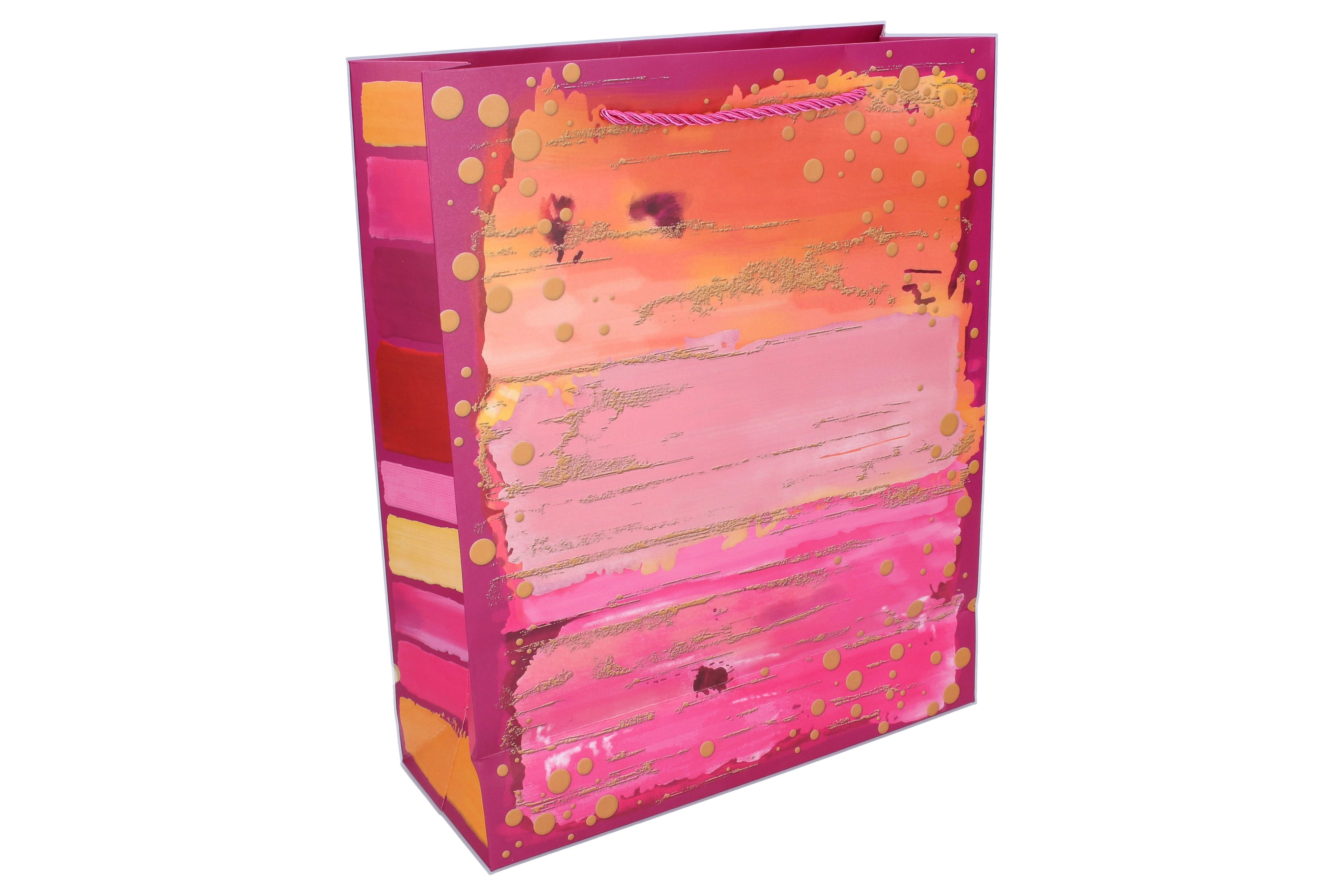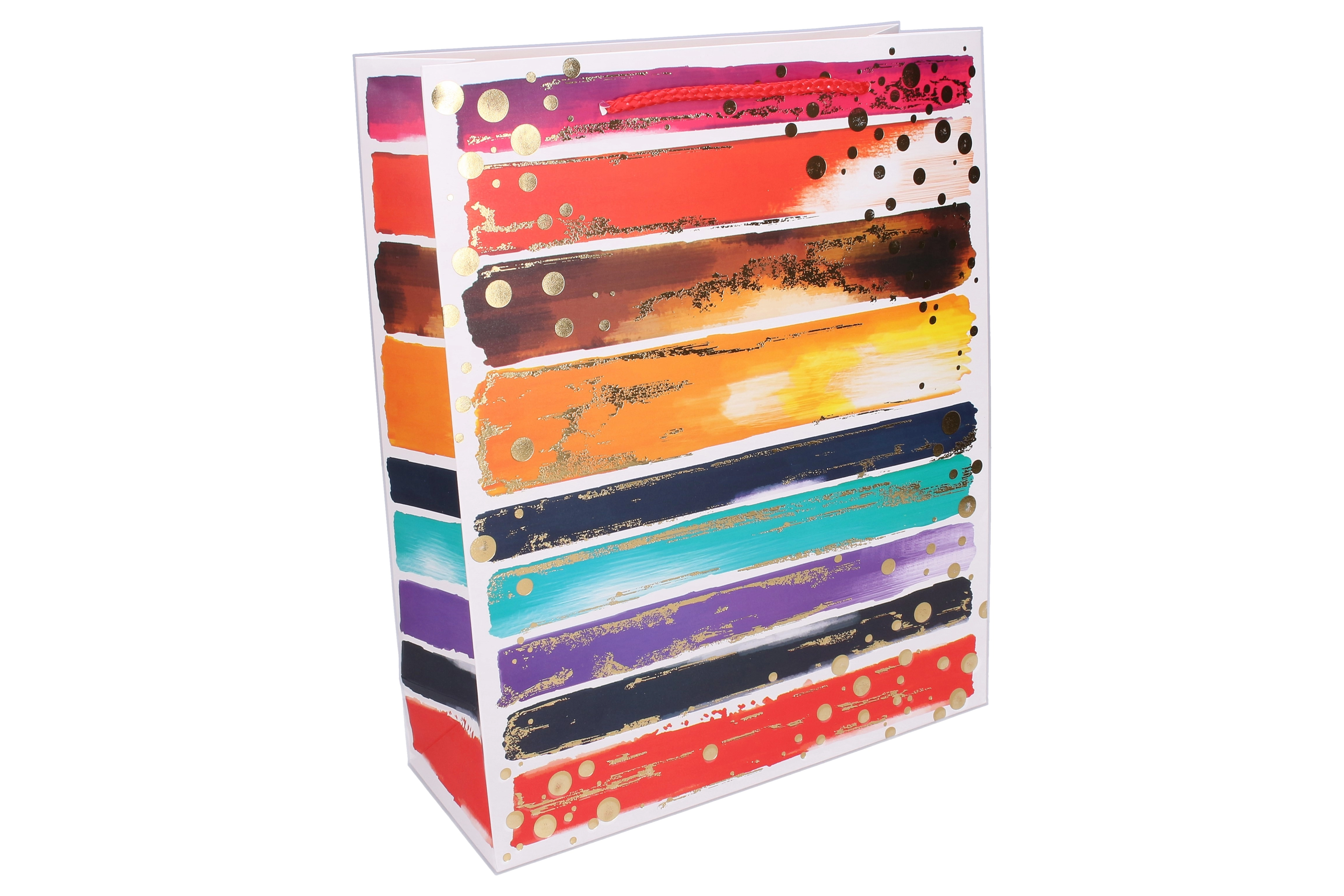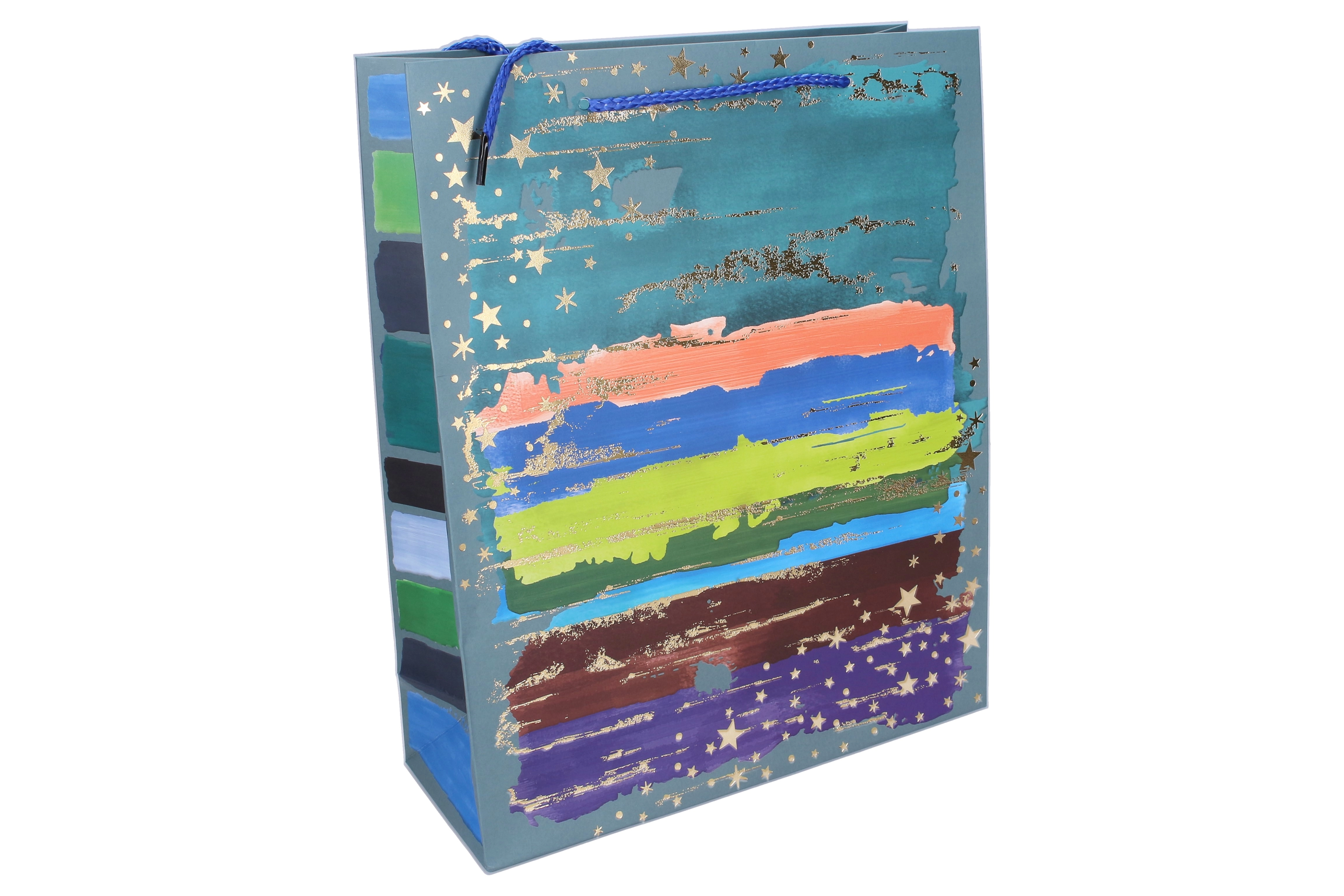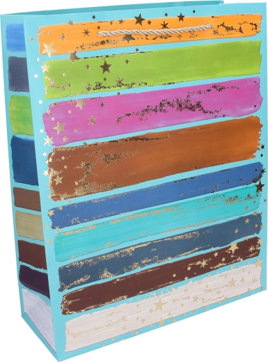 Questa busta regalo universale è ideale per compleanni, festività e omaggi aziendali. Grazie alla carta robusta, ai manici di qualità e ai rinforzi, sostiene il contenuto in modo sicuro offrendo al contempo un aspetto rappresentativo. Il design moderno con pennellate colorate e elementi metallici dorati dona a ogni regalo un look premium.