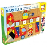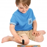 I bambini posizionano i pezzi e li fissano delicatamente con il martelletto. Il gioco rafforza la coordinazione occhio–mano, la pazienza e la precisione.