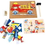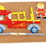 Forme e immagini in legno colorate su una base in sughero stimolano la fantasia e permettono di comporre autopompe, stazioni e intere scene.