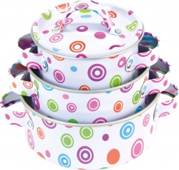 Questo set di pentole smaltate di qualità per bambini è ideale per giocare al cuoco e alla piccola padrona di casa. Pentole, padella e utensili in metallo hanno un aspetto autentico, così i bambini potranno divertirsi con una cucina e un servizio realistici. I pois colorati su fondo bianco donano all'intero set un aspetto allegro che ravviva ogni angolo per bambini.