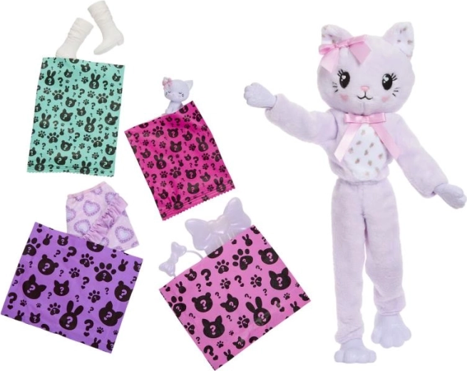 Scopri una sorpresa giocosa con la bambola Barbie Cutie Reveal in costume da gattino viola con fiocco dolce. Ti aspettano 10 sorprese, inclusi accessori di moda, un mini gattino e divertenti funzioni 2 in 1 con effetto di cambio di colore per un gioco ancora più creativo.