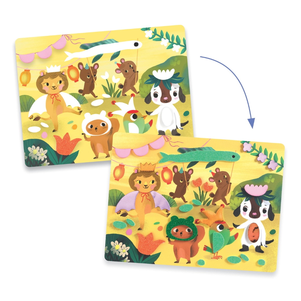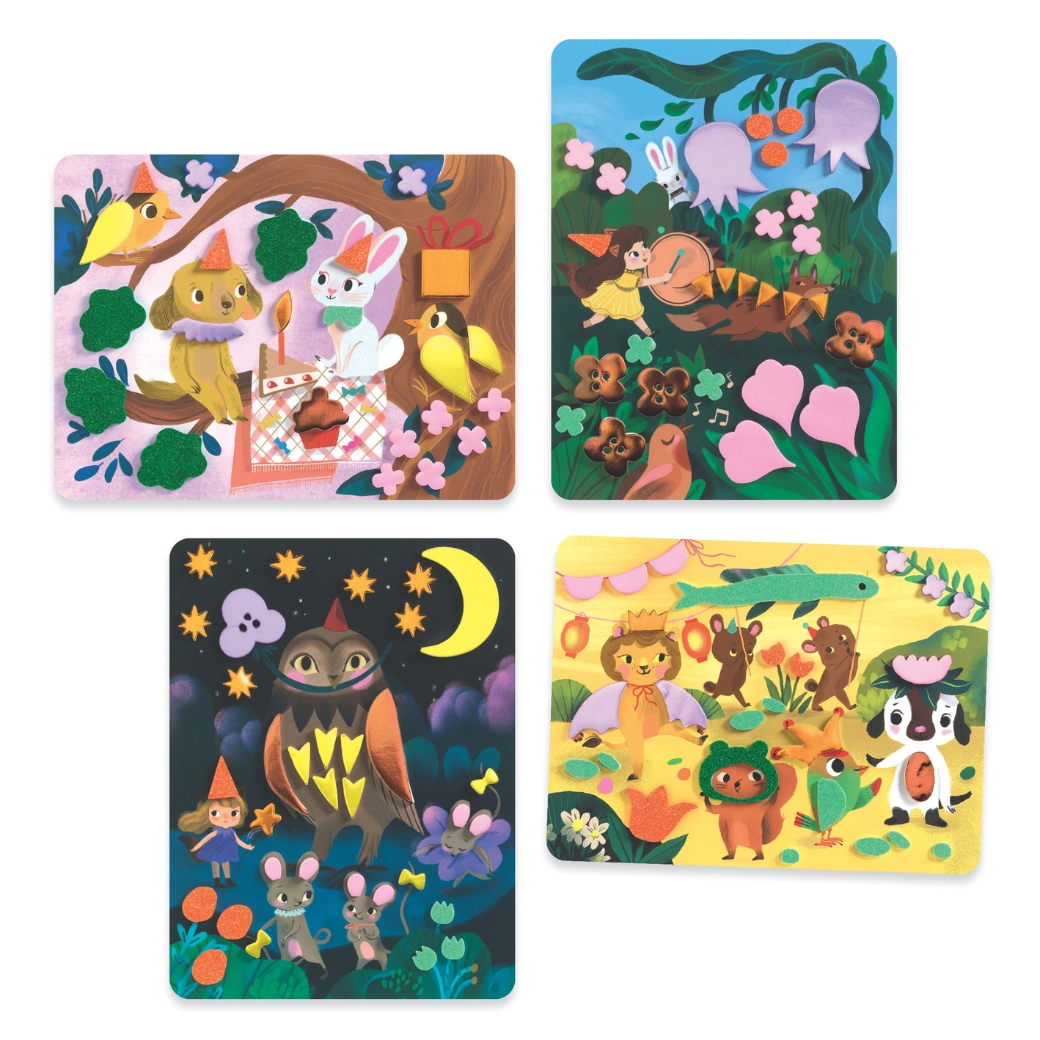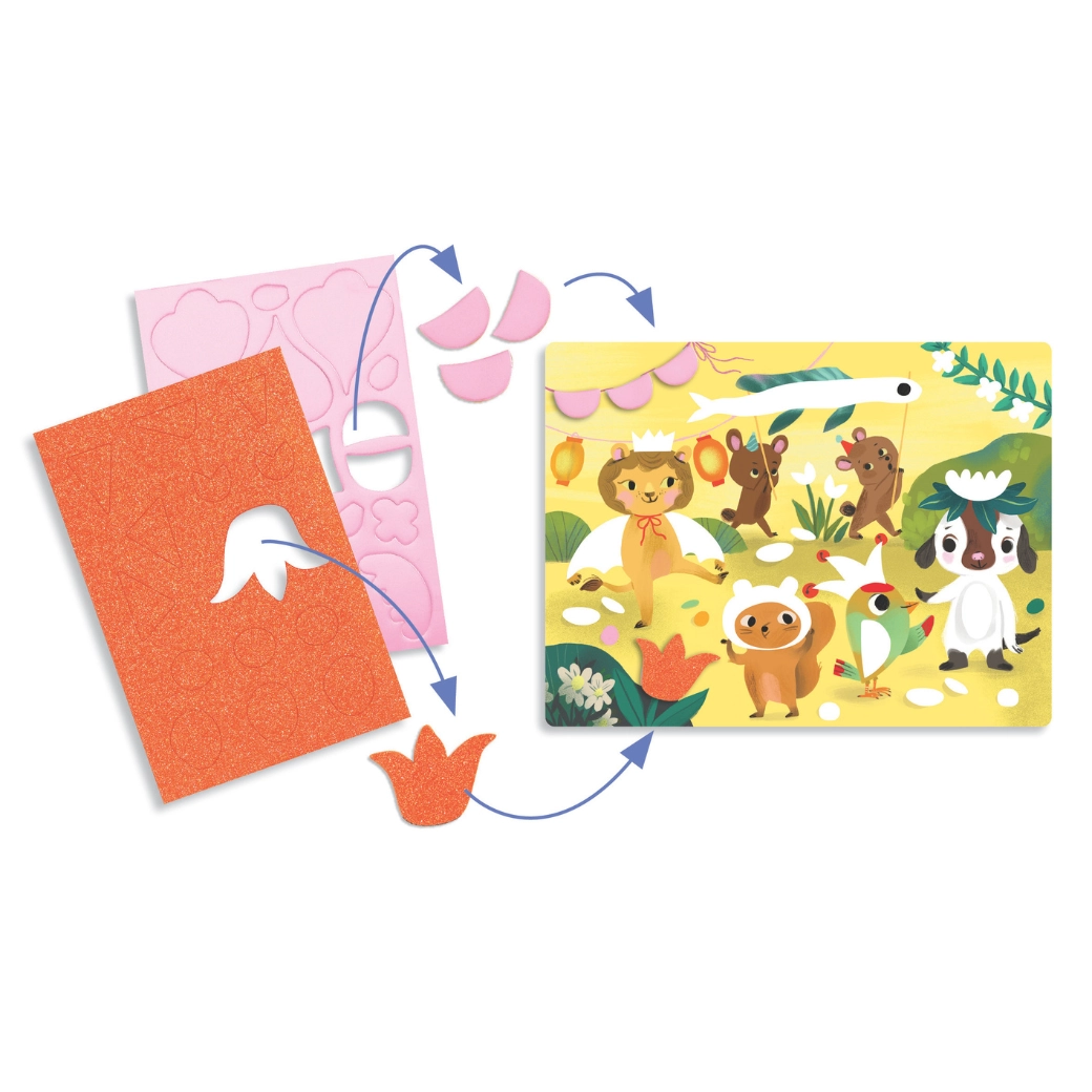 Grazie alle forme adesive in gommapiuma con superficie lucida, i bambini creano facilmente opere brillanti con animaletti alla festa. Niente disordine: basta staccare e incollare.