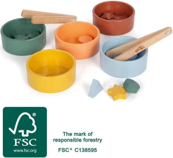 Questo set educativo unisce la naturale curiosità dei bambini ai principi Montessori. Ciotole e forme in legno dai colori intensi invitano al gioco libero, al classificare e al trasferimento con pinze in legno. I bambini sviluppano presa, precisione e concentrazione e allo stesso tempo imparano il riconoscimento di forme e colori.