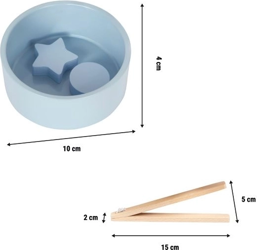 Le pinze in legno aiutano i bambini ad allenare la presa, la precisione e la coordinazione occhio–mano trasferendo i pezzi da una ciotola all’altra.