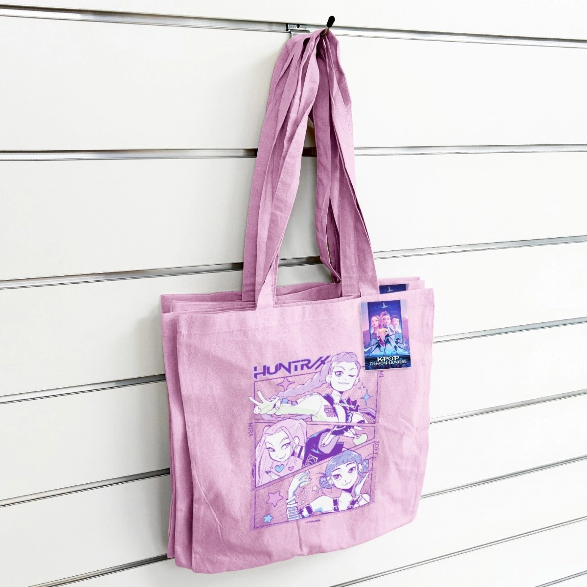 Mostra la tua passione per il K-POP e per il team Demon Hunters con questa borsa rosa in cotone. Perfetta per la città, la scuola e i concerti: si piega facilmente e ce l’hai sempre a portata di mano. Grazie al cotone resistente è adatta a libri, piccoli acquisti e accessori.