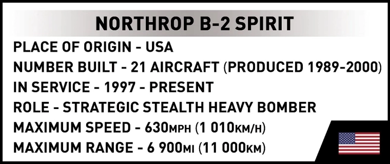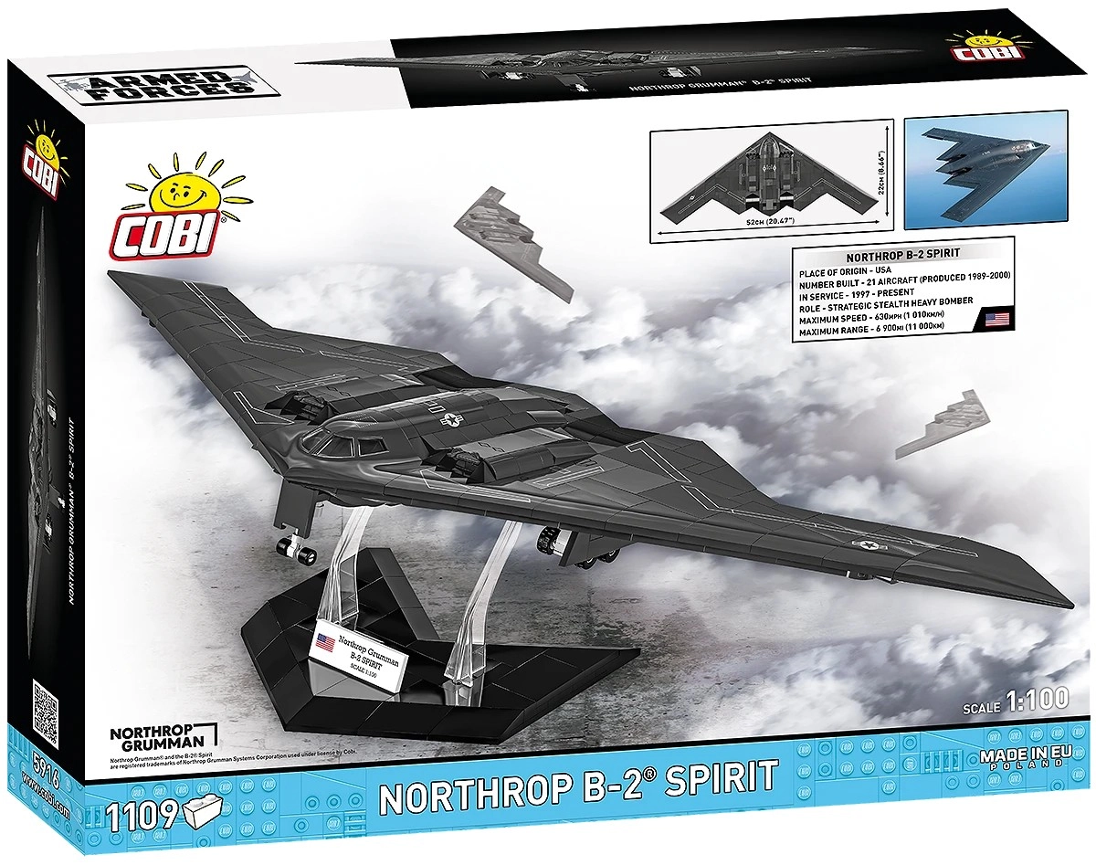 Crea la tua leggenda dell’aviazione: il NORTHROP B-2 SPIRIT di COBI è un set di costruzione preciso con eccellente accuratezza ingegneristica, che riproduce fedelmente la caratteristica “ala volante” e le superfici stealth piatte. Grazie alla scala 1:100 e ai pezzi progettati su misura otterrai un modello da esposizione di grande impatto con dettagli impressionanti.