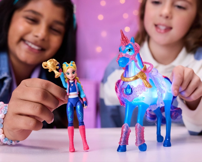 Il set ispirato all’amata serie Unicorn Academy offre ai bambini la possibilità di rivivere le scene di allenamento e creare nuove storie magiche. L’unicorno River, in plastica traslucida, si illumina in splendide tonalità di blu e, grazie all’attivazione tramite pulsante sul collare o al passaggio sopra l’ostacolo, dona al gioco un’atmosfera unica.