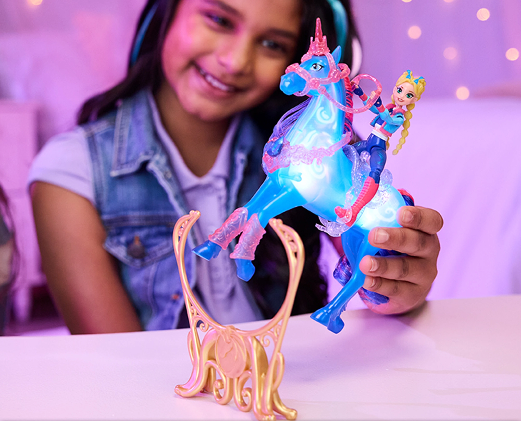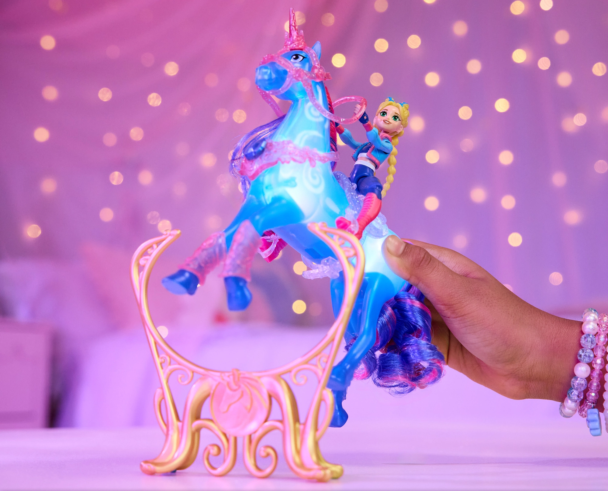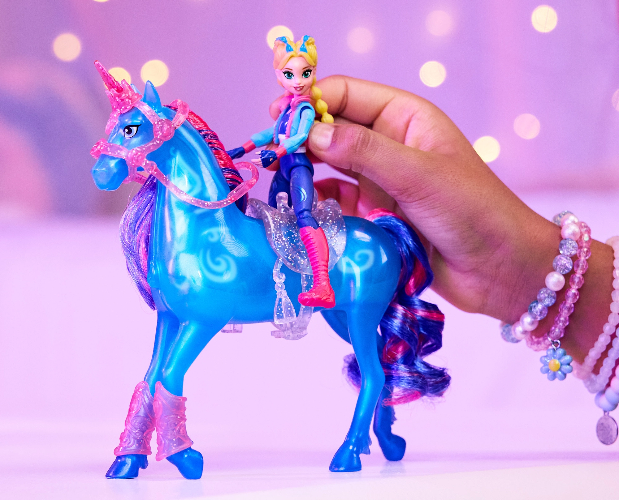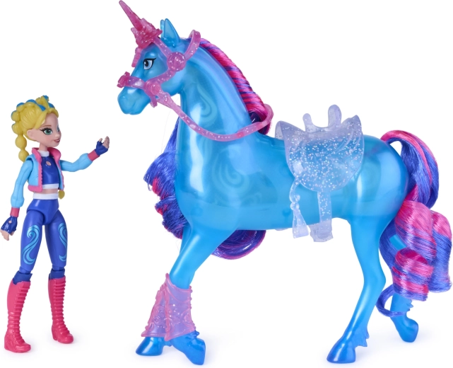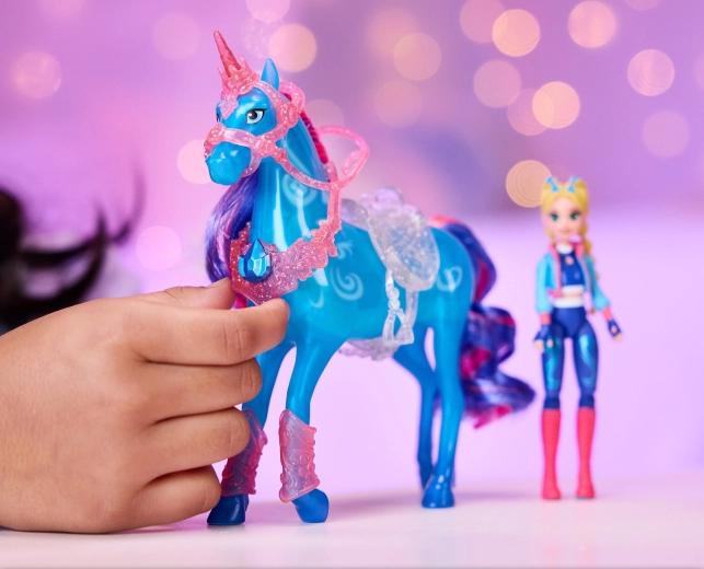 La bambola Isabel con 7 punti di articolazione e l’unicorno accessoriato permettono una cavalcata naturale, salti e un rearing scenografico sul supporto.