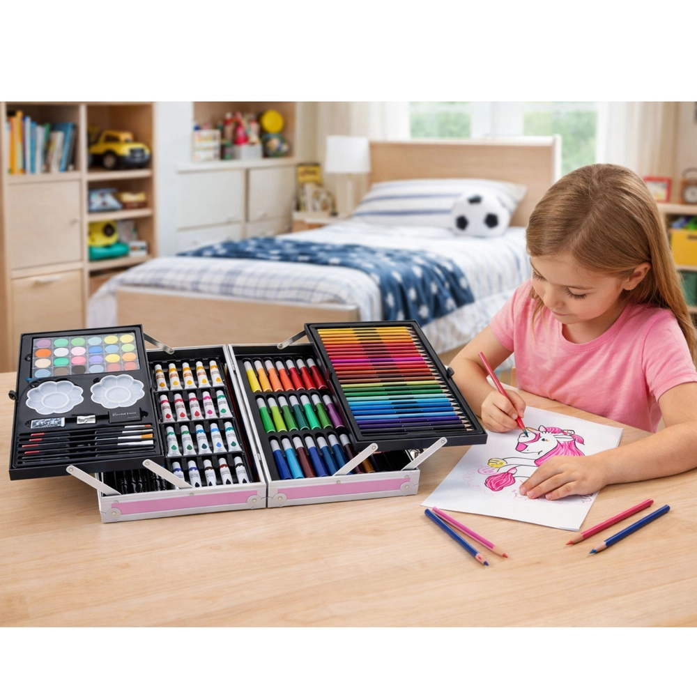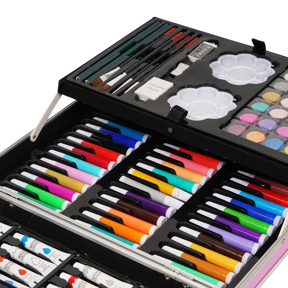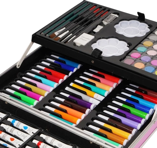 Il set include una ricca gamma di matite colorate, pennarelli, pastelli, acquerelli, pennelli e altri accessori, tutti perfettamente organizzati nei pratici scomparti a livelli della valigetta.