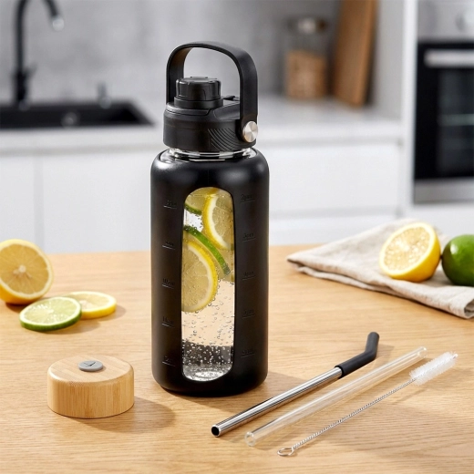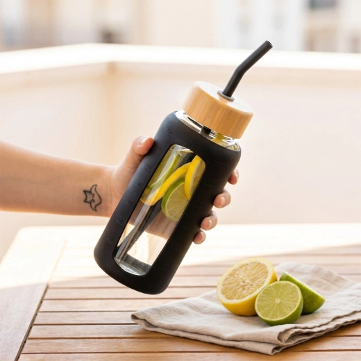 Nella confezione trovi due pratici coperchi: coperchio sportivo flip con beccuccio e manico per un facile trasporto e coperchio in bambù con foro per cannuccia. Inclusi anche due cannucce riutilizzabili (una in vetro e una in acciaio inox con puntale in silicone) e uno scovolino. La scala in ml (fino a 700 ml) e in once (4–34 oz) e i marcatori orari giornalieri (8–12 e 14–18) ti aiutano a bere regolarmente durante la giornata.