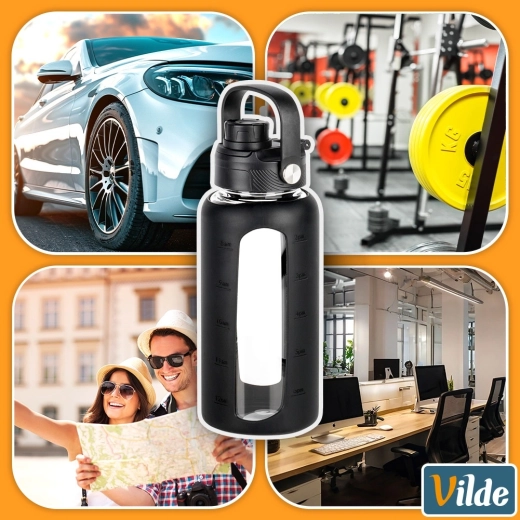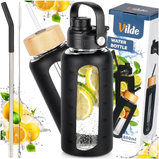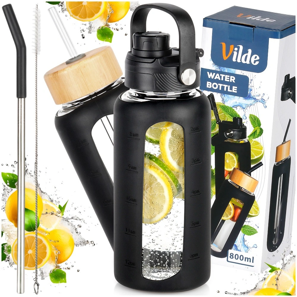 Elegante borraccia in vetro da 800 ml con resistente vetro borosilicato, custodia protettiva in silicone con finestra e tacche e due coperchi intercambiabili per bere con cannuccia o beccuccio sportivo. Grazie alla scala in ml e oz e ai marcatori orari monitori facilmente l’assunzione quotidiana di liquidi. Adatta a bevande calde e fredde, per casa, lavoro e viaggi.
