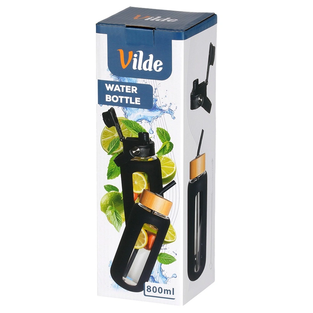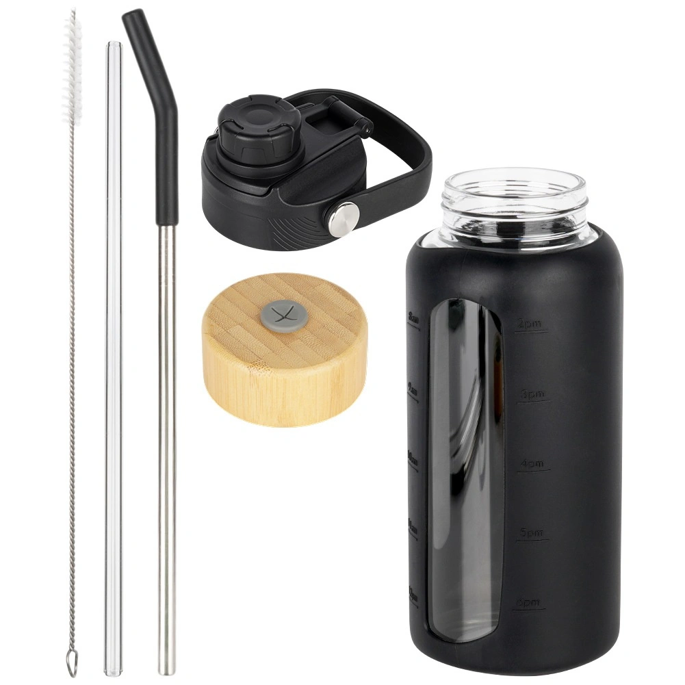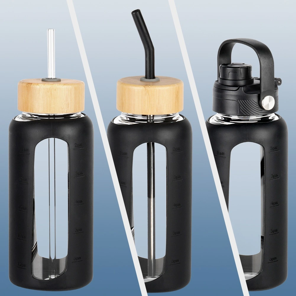 Borraccia in vetro con custodia protettiva in silicone e coperchi intercambiabili, nera 800 ml