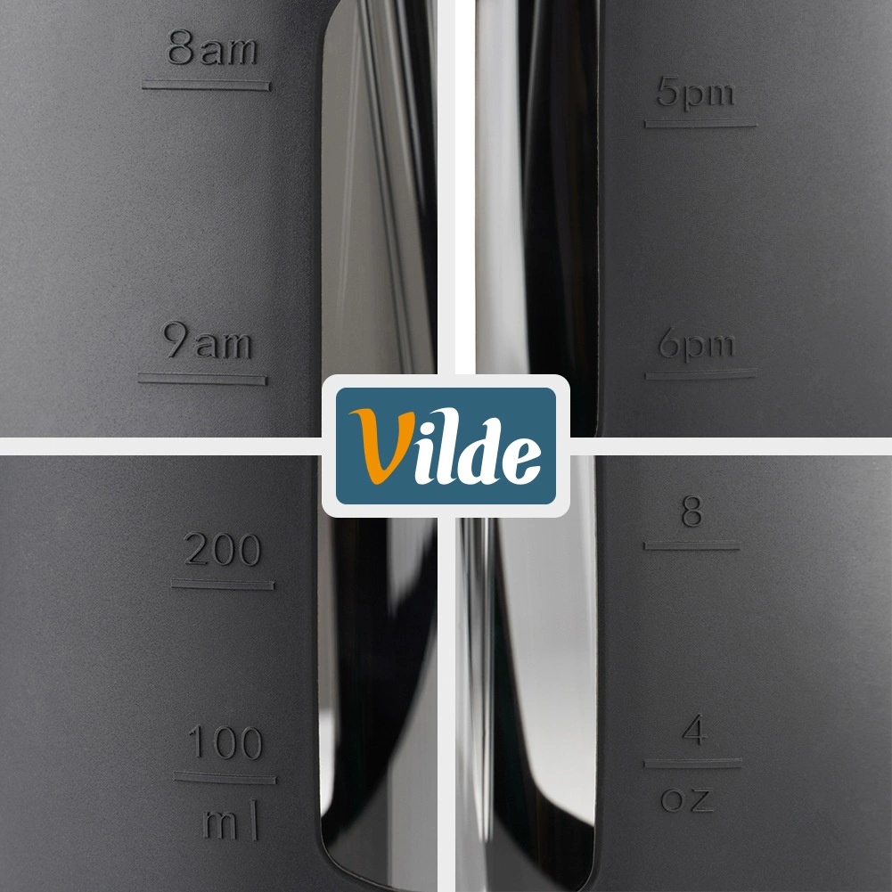 La custodia protettiva aumenta la resistenza e la sicurezza della presa. La finestra trasparente con tacche in ml e oz e con marcatori orari aiuta a monitorare l’assunzione quotidiana di liquidi.