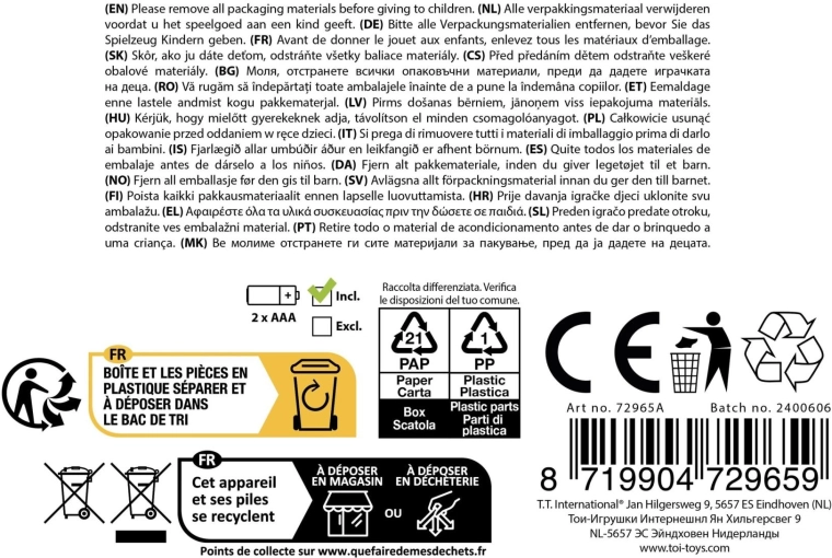 Il giocattolo è progettato pensando alle mani piccole: la forma ergonomica e il controllo semplice consentono una presa comoda e una facile pressione dei tasti. Le dimensioni compatte sono adatte sia in casa che in viaggio e la robusta struttura in plastica garantisce resistenza durante il gioco quotidiano.