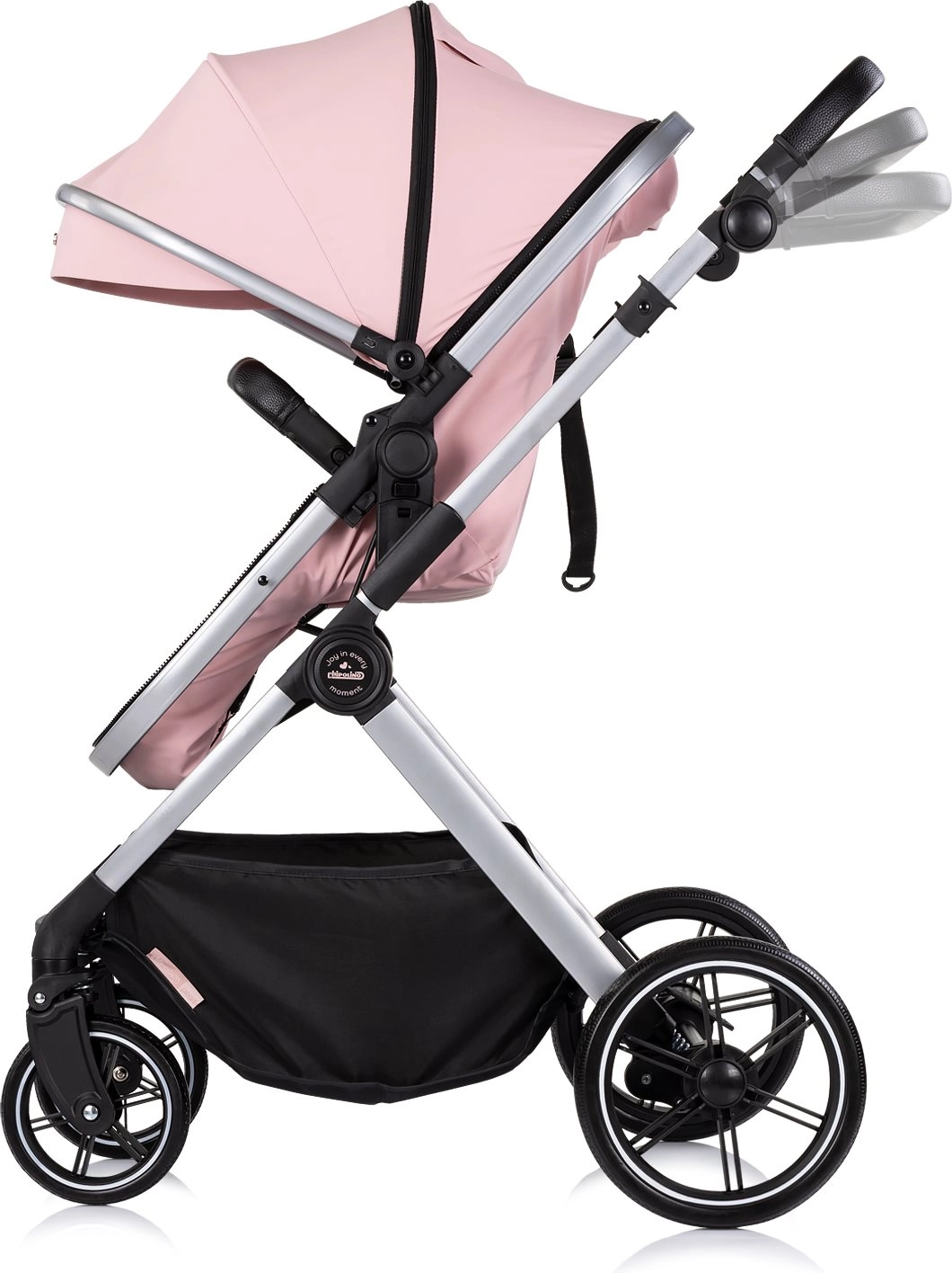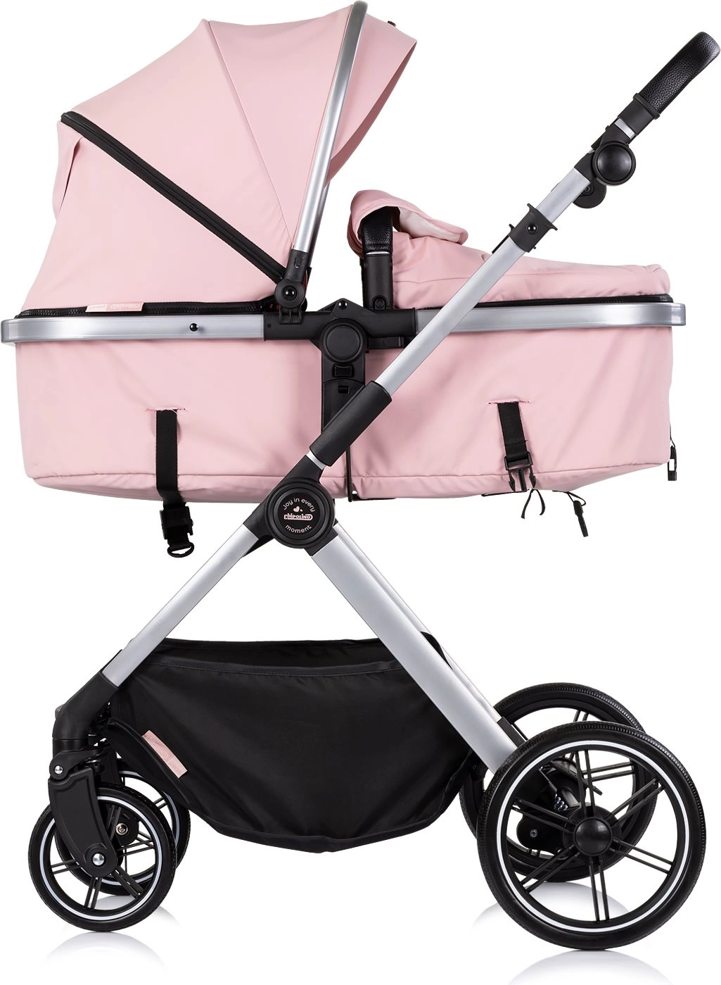 Elegante passeggino 2in1 CHIPOLINO PEARL in colore Powder Pink che combina navicella e seduta sportiva in un'unica unità. Offre sospensioni su tutte le ruote, ruote anteriori piroettanti bloccabili, maniglione regolabile in altezza e cestello capiente per le uscite quotidiane. La sicurezza è garantita da cinture a 5 punti e freno posteriore collegato. La certificazione EN 1888-1/2 conferma l'alto standard di qualità e sicurezza.
