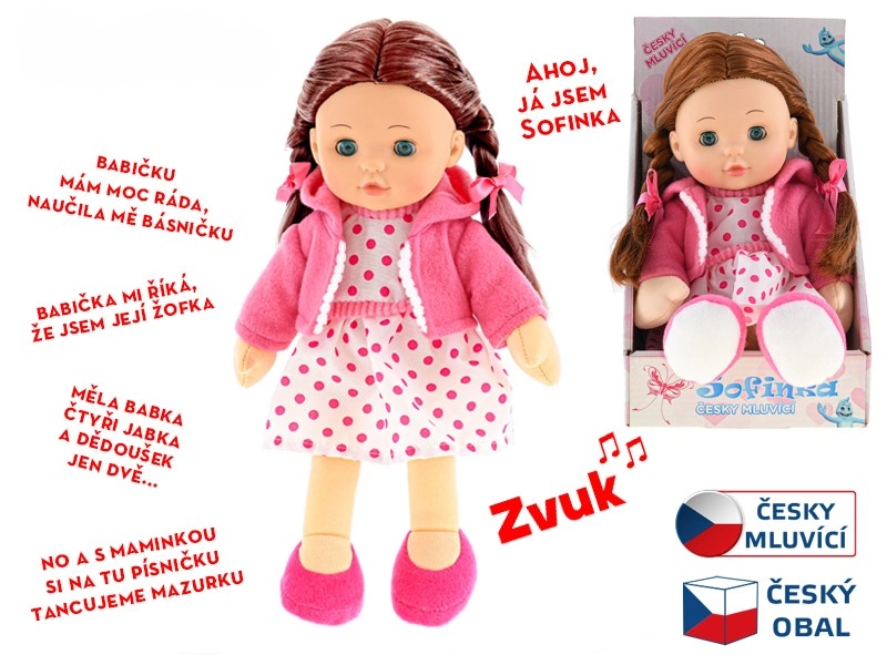 La bambola Sofinka è la compagna ideale per bambini dai 3 anni. Il suo corpo morbido è piacevole al tatto e invita alle coccole, mentre l’aspetto realistico con capelli castani e occhi che si chiudono stimola la fantasia dei bambini. Inoltre, Sofinka parla in ceco, favorendo in modo divertente la comunicazione e l’empatia.