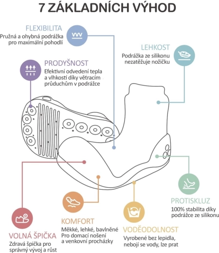 Grazie alla loro leggerezza, elasticità e traspirabilità sono perfette come scarpine da casa, pantofole per asili e aree gioco, nonché per giocare all’aperto in giornate calde e asciutte. Apprezzerai anche la facile manutenzione: si possono lavare in lavatrice (programma lavaggio a mano, in sacchetto).