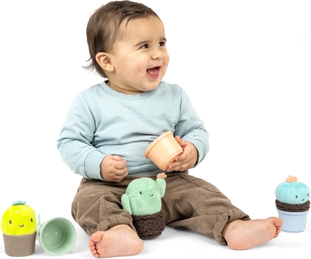 I bicchierini si possono impilare uno sopra l’altro e annidare uno dentro l’altro, mentre i morbidi cactus si inseriscono nei “vasetti”. Il bambino esplora dimensioni, sequenze e relazioni spaziali.