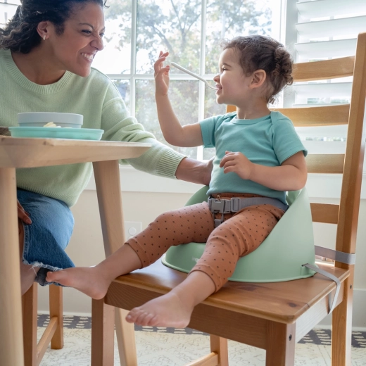 La cintura di sicurezza regolabile a 3 punti mantiene il bambino in una posizione comoda e stabile durante i pasti e il gioco al tavolo.