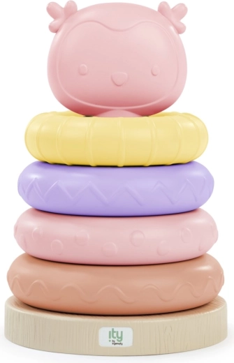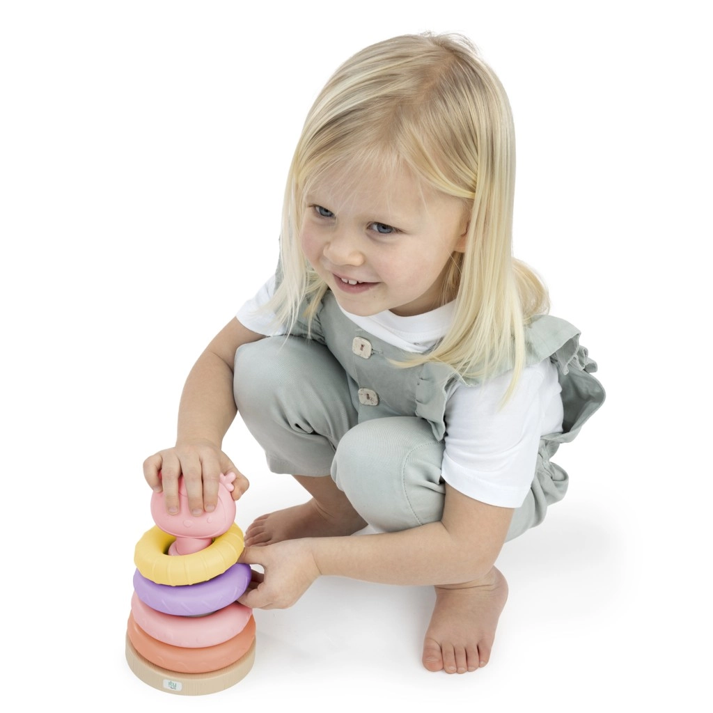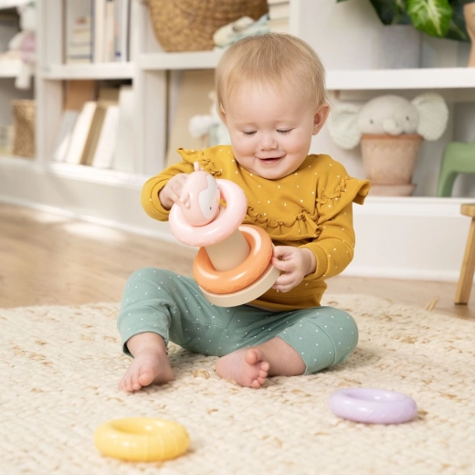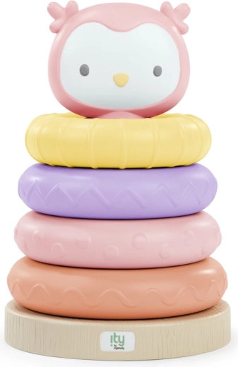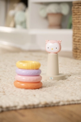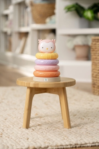 La solida base effetto legno mantiene la piramide stabile durante il gioco, mentre la gufetta in cima motiva i piccoli a completare la costruzione.