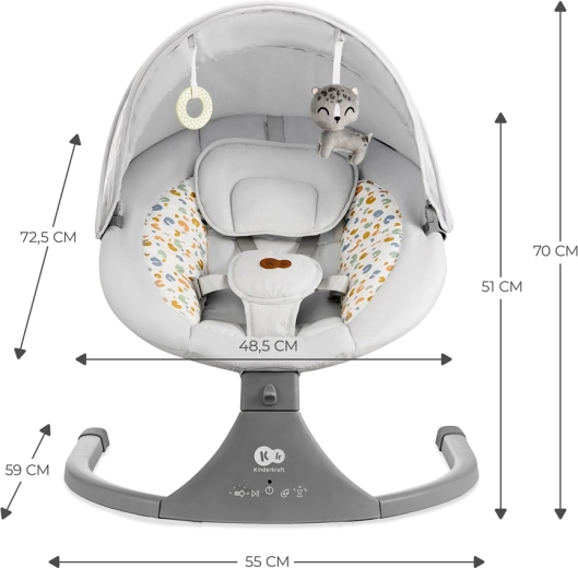 Cinture a 5 punti con regolazione in altezza, morbida imbottitura con poggiatesta e giostrina regolabile con 2 giochi in peluche per divertimento e stimolazione sensoriale.