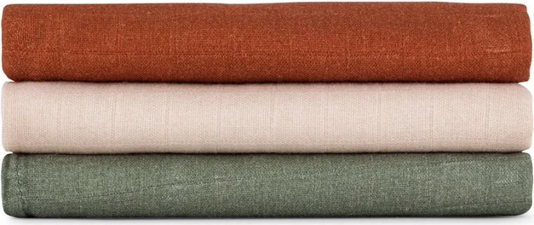 La versatilità è perfetta a casa e in viaggio: come pannetto, asciughino, copertina, fasciatura o panno per il ruttino. La mussola è ariosa, resistente agli odori e, grazie alla termoregolazione, rinfresca d’estate e scalda d’inverno. Le eleganti tonalità Earth Tones si abbinano facilmente al corredo.