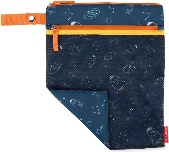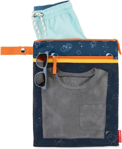 Pratico e stiloso sacchetto impermeabile Skip Hop Spark Style Rocket con dimensioni 30 × 38 cm, ideale per viaggi, piscina e spiaggia. Offre due scomparti separati per oggetti bagnati e asciutti, una grande tasca con zip per una custodia sicura e un laccetto removibile per un facile aggancio al passeggino. Facile manutenzione – lavabile in lavatrice.