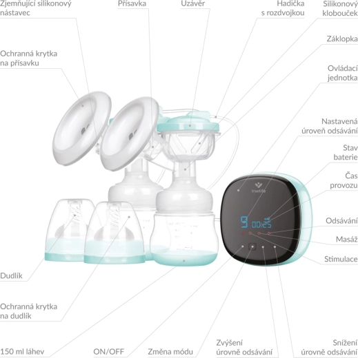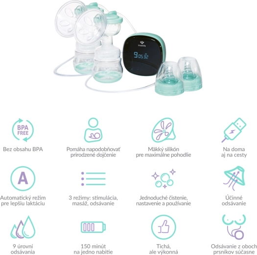 Il controllo è semplice grazie al display LED con pulsanti touch e al pratico timer. Scegli tra 3 modalità – stimolazione, massaggio ed estrazione – e tra 9 livelli di intensità per il massimo comfort. La struttura leggera, le dimensioni compatte e la batteria con autonomia fino a 150 minuti rendono questo tiralatte l’aiutante ideale a casa e in viaggio. I morbidi cuscinetti in silicone con bordo flessibile e i materiali senza BPA garantiscono sicurezza per te e il tuo bambino.