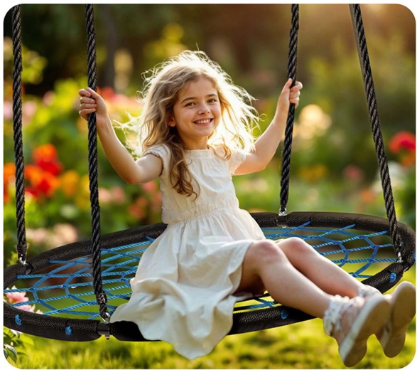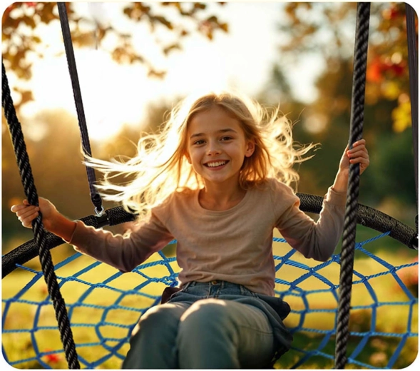 Ampia superficie a rete tipo “ragnatela” che offre comfort sia da seduti sia sdraiati e può ospitare più bambini contemporaneamente. Ideale per il gioco condiviso e per un dondolio rilassante.