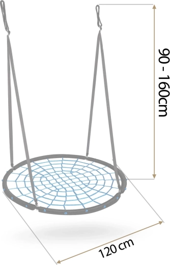 Il grande nido di cicogna da 120 cm offre un dondolio stabile e sicuro grazie alla struttura in acciaio con rivestimento protettivo in PE e alla fitta rete tipo “ragnatela”. L’ampia seduta è comoda sia da seduti che sdraiati e drena bene l’acqua dopo la pioggia, permettendo un’asciugatura rapida.