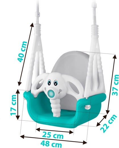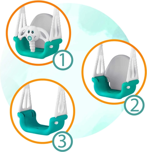 Altalena universale per bambini 3in1 con simpatico motivo dell’elefantino, cresce con il tuo bambino da 6 mesi fino a 10 anni. Offre schienale alto, barra di sicurezza anteriore e corde robuste regolabili per un dondolio sicuro in casa e all’aperto. Struttura in plastica impermeabile resistente, seduta antiscivolo e certificazioni CE, GS per la massima tranquillità dei genitori.