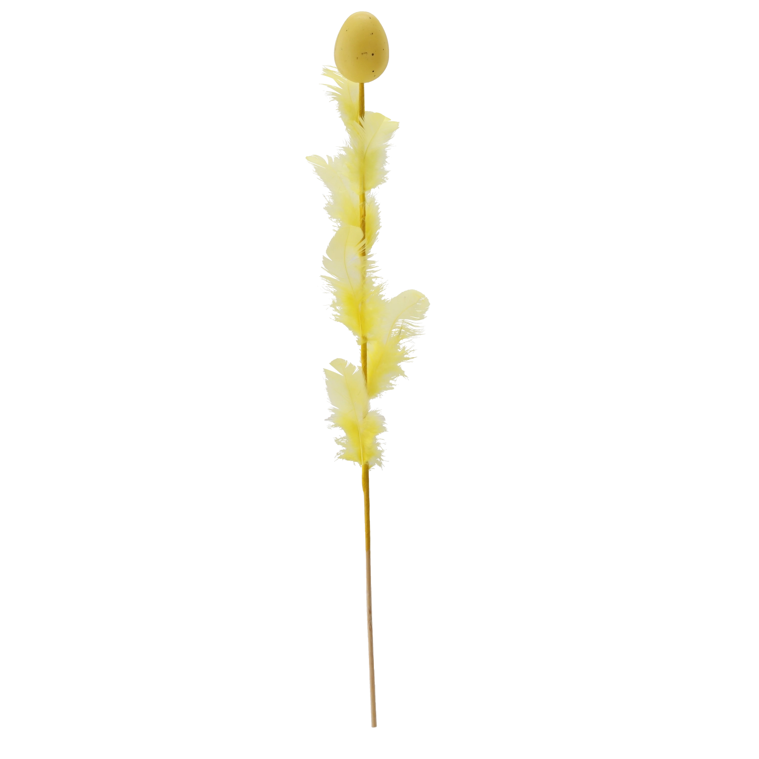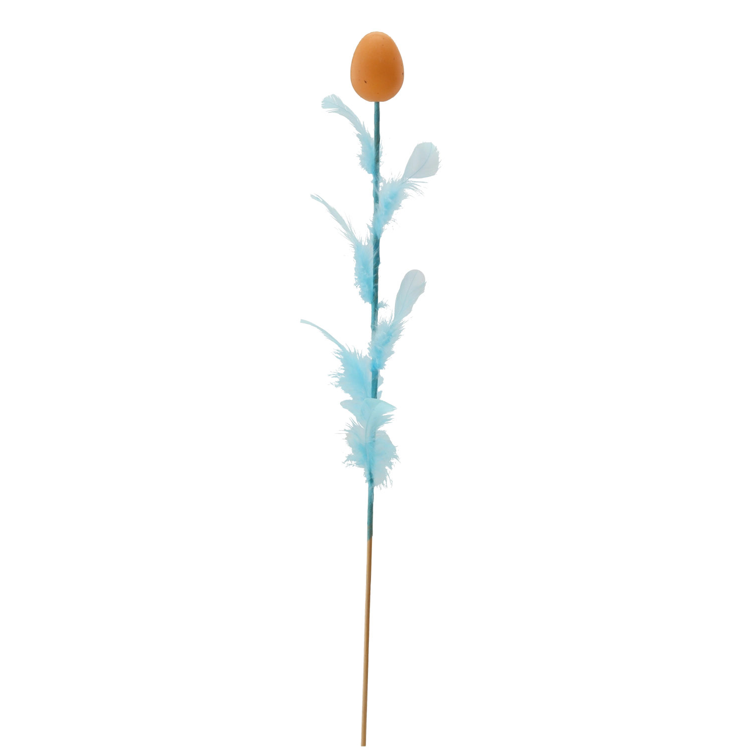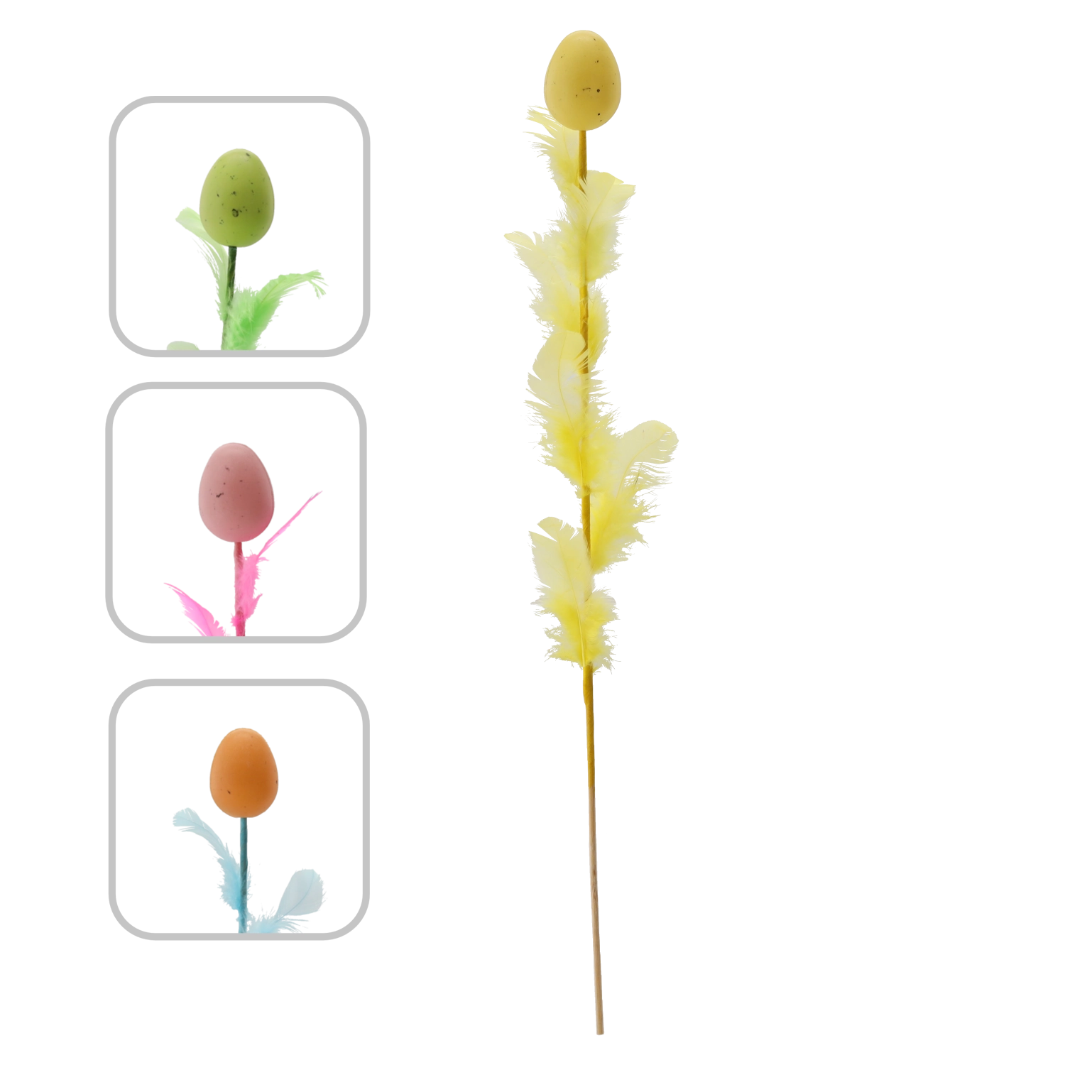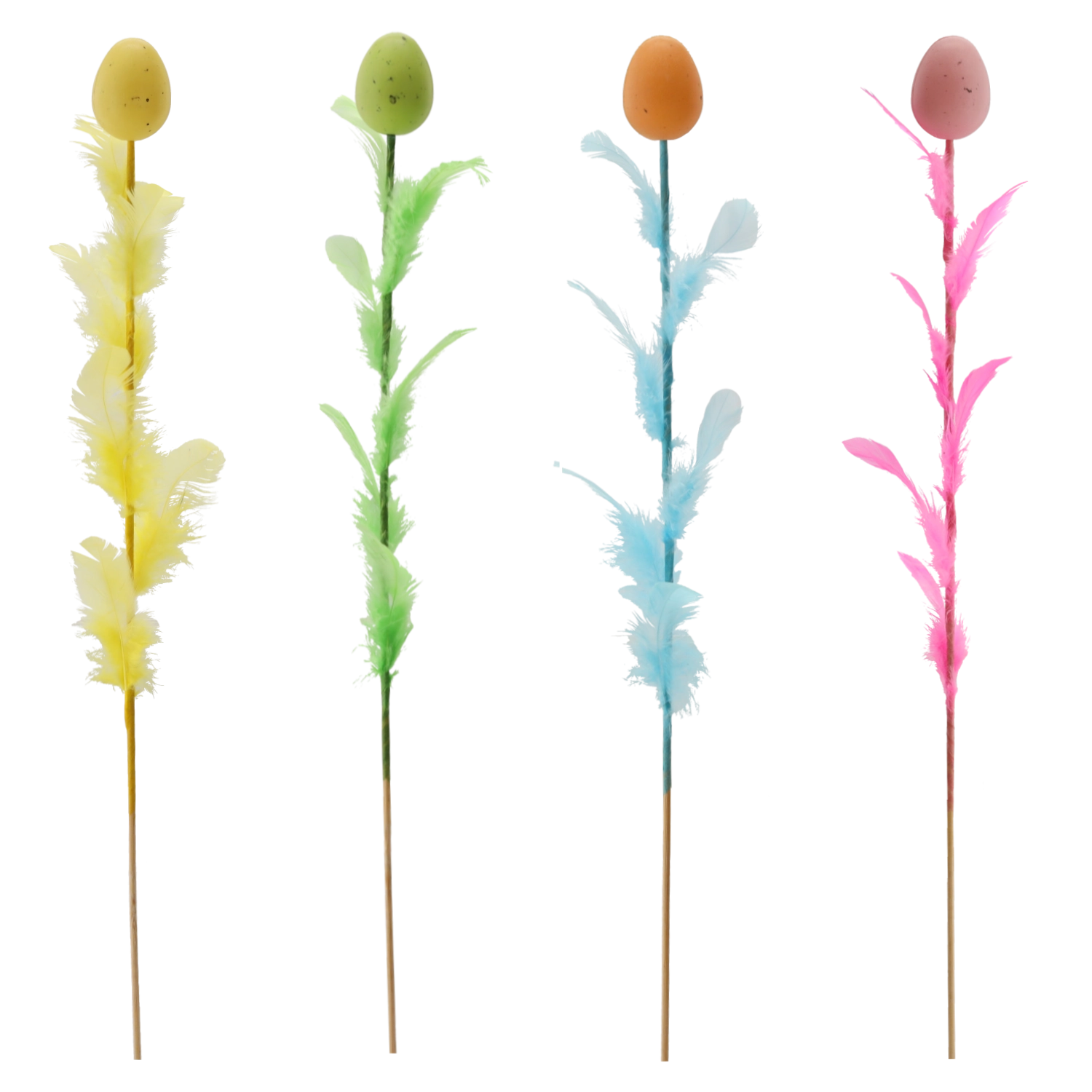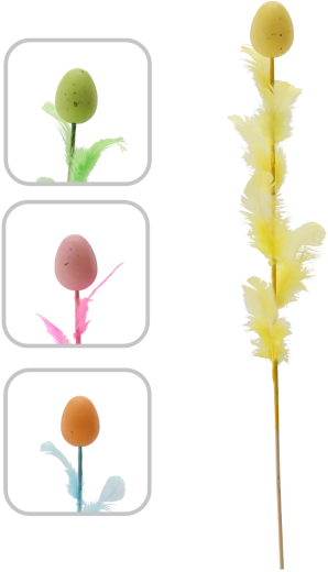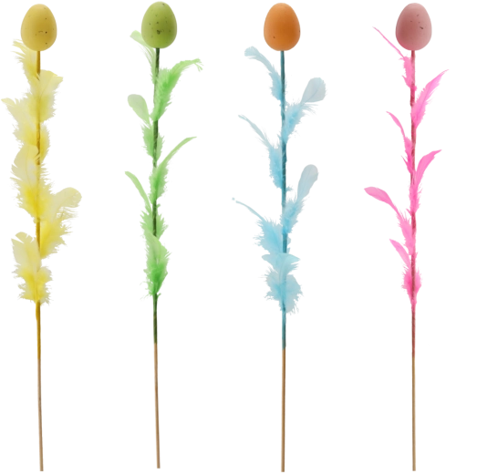 Elegante decorazione pasquale a forma di uovo con piume su picchetto da 45 cm che illuminerà le tue composizioni festive. Offre un mix di quattro colori freschi, che donano agli interni vivacità e un'atmosfera primaverile. Le delicate piume per leggerezza e ariosità la rendono la scelta ideale per bouquet, cestini e vasi.