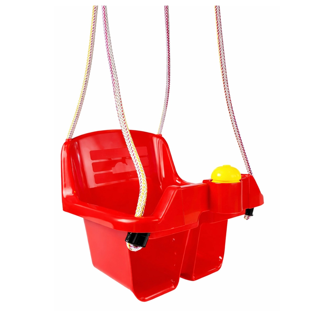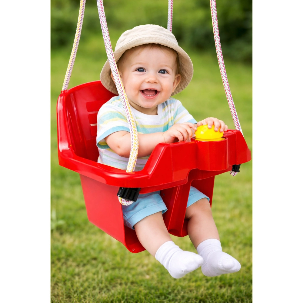 Sicura altalena rossa a secchiello per i più piccoli con alto schienale, barra di protezione anteriore e solido sistema di sospensione. Offre un sedile profondo, un supporto stabile per la schiena e plastica resistente adatta al giardino e agli interni. Inclusa una divertente trombetta che farà felice ogni bebè.