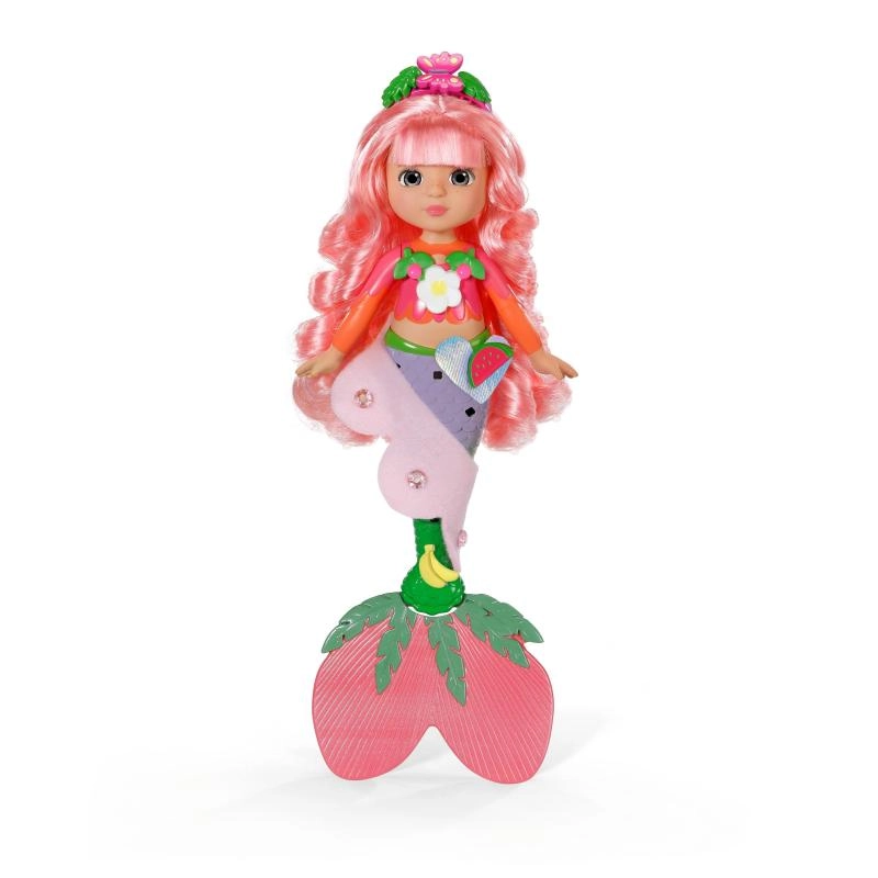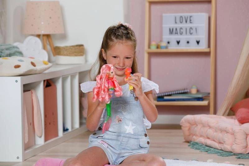 Sunshine ha braccia articolate per posare e giocare con facilità. Si può decorare non solo i capelli, ma anche la coda e la pinna, creando combinazioni originali per ogni giorno. L’opuscolo d’ispirazione mostra ulteriori idee fai‑da‑te con materiali che i bambini hanno comunemente in casa – il divertimento non finisce mai.