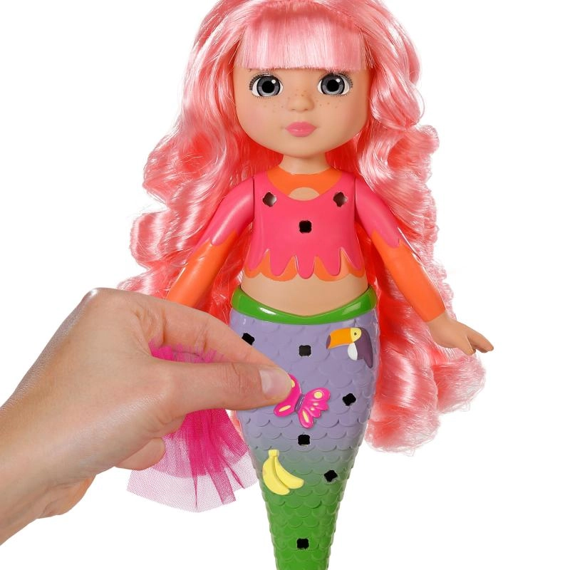 Entra nel scintillante mondo di BABY born Glam Up! Sunshine è una sirena che ama le trasformazioni – dall’acconciatura fino alla pinna. Grazie ai lunghi capelli rosa con magico effetto UV creerai ogni volta un look diverso e al sole vivrai un vero momento wow. Gli accessori tessili inclusi, le decorazioni colorate a clip e il tenero mini animaletto con pinna removibile aprono ai bambini un mondo di styling fantasioso e di storie da inventare.