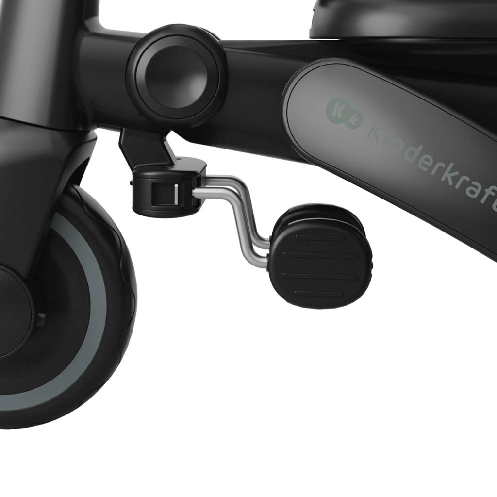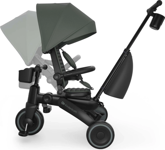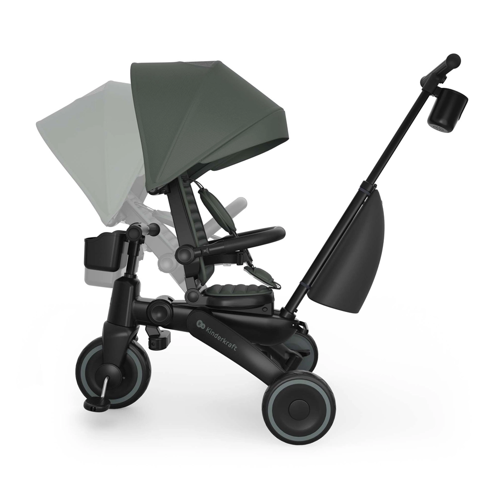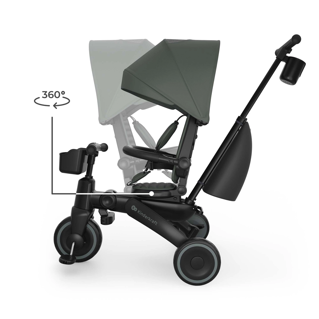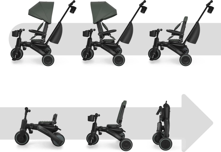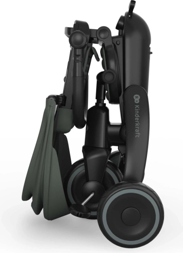 Il telaio pieghevole con doppia sicurezza garantisce una chiusura rapida e sicura in dimensioni compatte. Il triciclo può essere riposto stabilmente in posizione verticale o orizzontale, una comodità in casa, in ascensore e nel bagagliaio dell’auto. L’ampia capottina con filtro UPF 50+ e trattamento idrorepellente protegge dal sole e dalla pioggerellina; il pannello di ventilazione e la finestrella peek-a-boo migliorano il flusso d’aria e il contatto con il bambino.