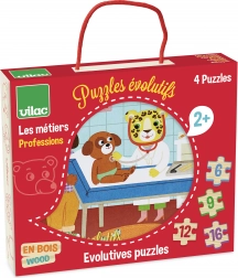 Questo set include quattro puzzle progressivi con motivi di diversi mestieri, progettati per motivare i bambini a migliorare gradualmente. Grazie al differente numero di pezzi, le piccole mani imparano le corrette tecniche di assemblaggio e a riconoscere forme e colori.